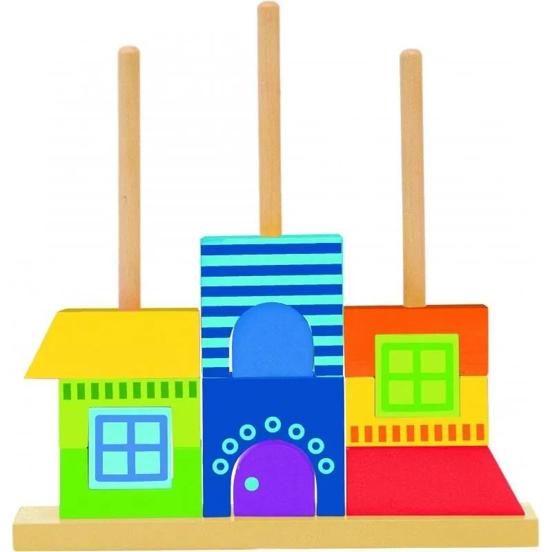 Koka klucīši ir jāuzver uz 3 tapām tādā veidā, lai izveidotu jautru krāsainu namiņu.