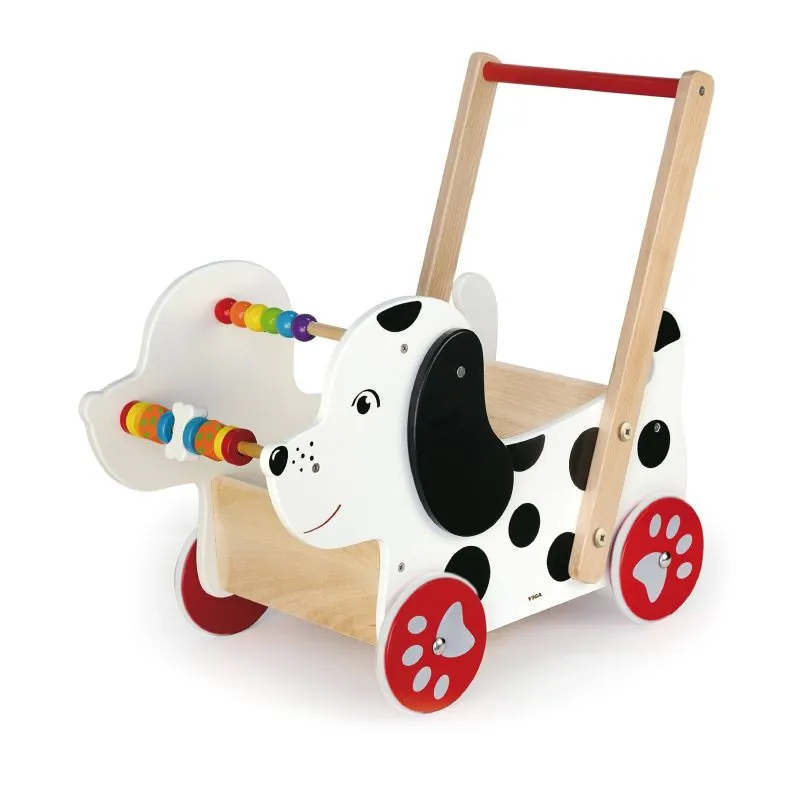 Daudzfunkcionāls koka ratiņš suņa formā.Izgatavots no augstas kvalitātes koka, pārklāts ar bērniem nekaitīgām krāsām.Mazākiem bērniem, pirmajās pastaigās, kalpos kā ratiņš.Uz ratiņa priekšējās sienas ir daudz spēļu elementu, kas attīstīs bērna motoriskās prasmes, veicinās radošumu.Ieteicamais vecums: 12+ mēn.