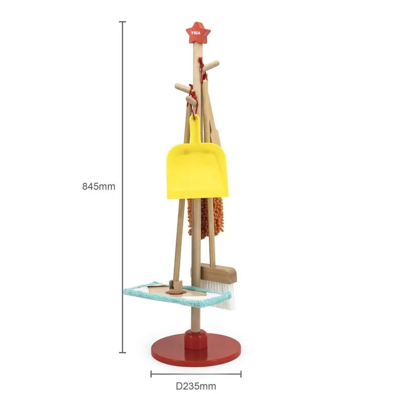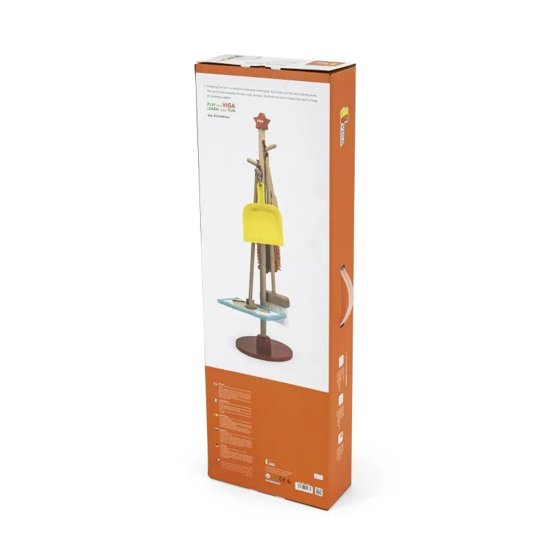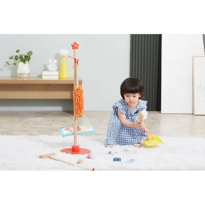 Tīrīšanu bērni parasti uztver kā nepatīkamu pienākumu vai garlaicīgu un nogurdinošu darbību.Priekšmetus var viegli uzglabāt, izmantojot statīvu ar sarkanu pamatni, uz kura var pakarināt instrumentus.Tīrīšanas komplekta dēļ bērns iemācīsies izmantot atsevišķus priekšmetus.Mazulis iemācīsies rūpēties par kārtību un tīrību ne tikai savā istabā.Komplektā ietilpst statīvs, grīdas birste, slota, lupata un liekšķere.Izgatavoti no augstas kvalitātes koka un krāsoti ar netoksiskām krāsām, tāpēc ir pilnīgi droši bērnam.Rotaļlieta veicina mācīties uzturēt kārtību, attīsta smalko motoriku un līdzsvaru.