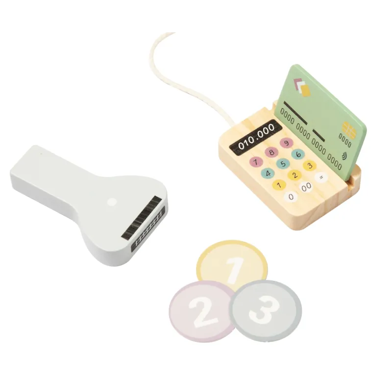 Iemācīties izmantot maksājumu karti – terminālis un koka karte māca bērniem par mūsdienu maksājumu veidiem;