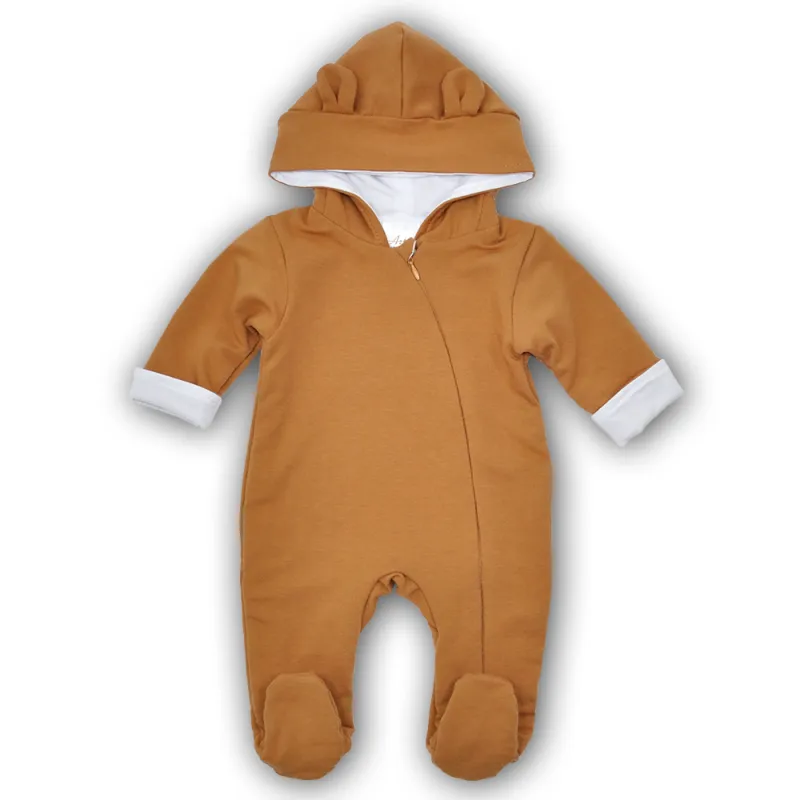 Siltināts 100% kokvilnas kombinezons zīdaiņiem ar kapuci un aizvērtām pēdiņām.