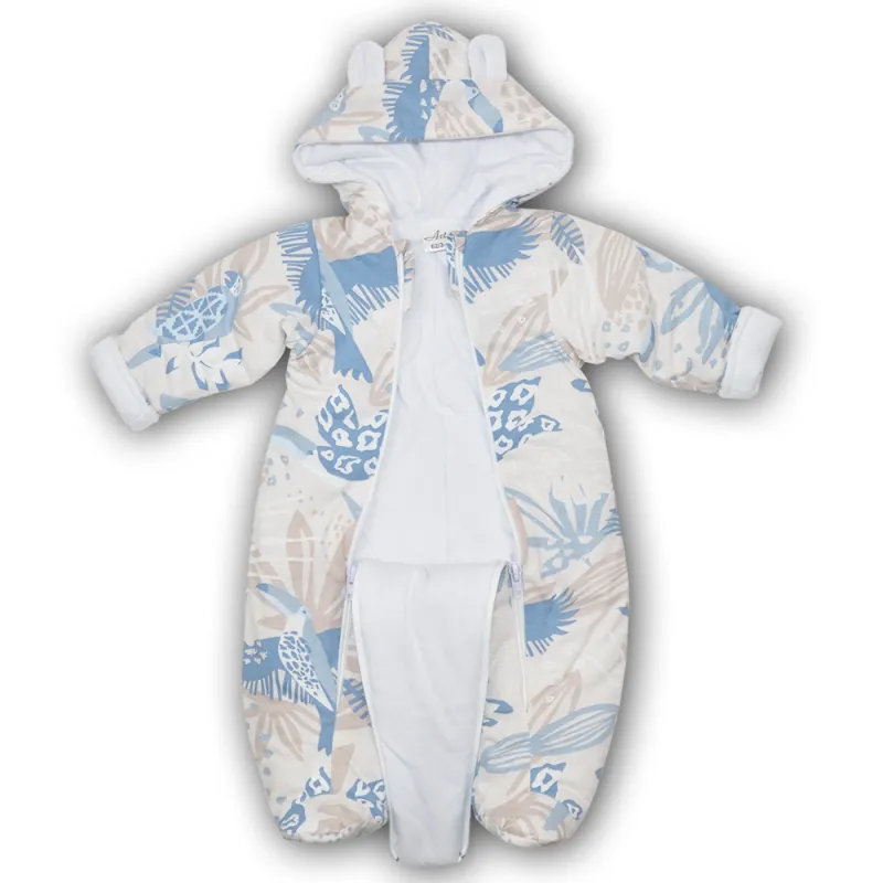 Siltināts 100% kokvilnas kombinezons zīdaiņiem ar kapuci un aizvērtām pēdiņām.