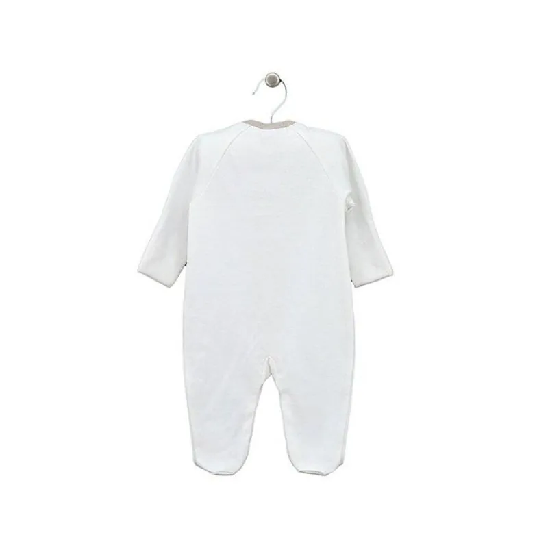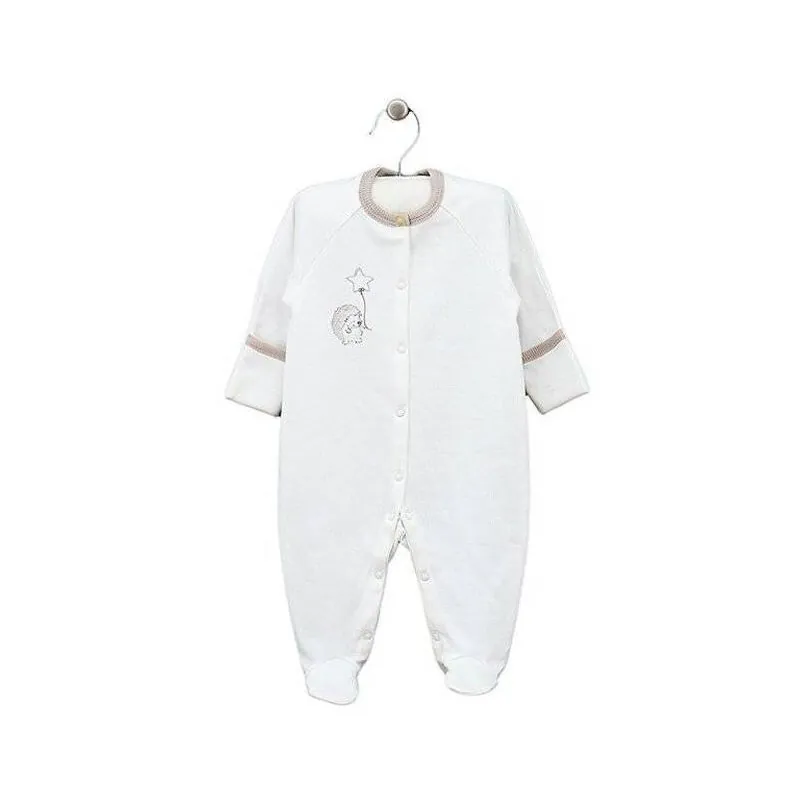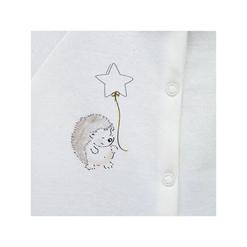 Ar garām piedurknēm;Ar atliekamām cimdiņām;Ar aizvērtām pēdiņām;Izgatavots no mīksta un maiga trikotāžas, sertificēta pēc Oeko-tex standarta 100.Aizdarāms ar spiedpogām priekšpusē līdz pat pēdiņām;Apsienams;Augstas kvalitātes apģērbs atbilst ES standartiem.Krāsa: balta;Izgatavots Lietuvā;