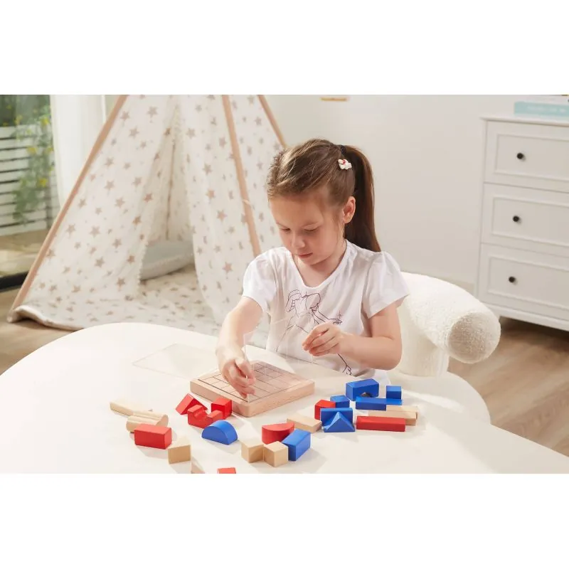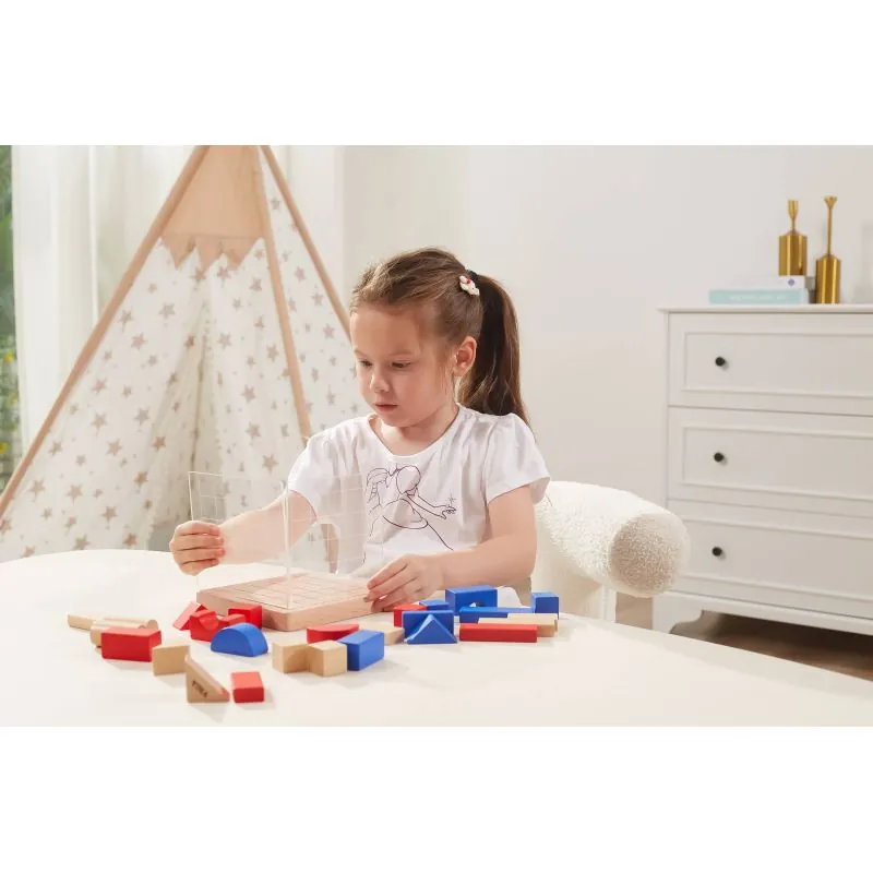 Komplektā ietilpst 26 koka klucīši, 2 rullīšu plāksnes, 1 pamatne un 1 grāmatiņa ar 32 konstrukcijas piedāvājumiem.Bērni izmanto telpisko modelēšanu, veidojot bloku struktūras pēc sniegtajām instrukcijām. nPiedāvājumi vadlīnijās ir sadalīti no viegliem līdz sarežģītiem. Šāda spēle attīsta bērna motorisko koordināciju, loģisko domāšanu un orientāciju telpā.Katrs klucītis ir izgatavots no kvalitatīvas koksnes un krāsots ar netoksiskām krāsām spilgtās krāsās, kas veicina uzmanību.Paredzēts bērniem, kas vecāki par 36 mēnešiem.155 mm x P 155 mm x A 152 mm