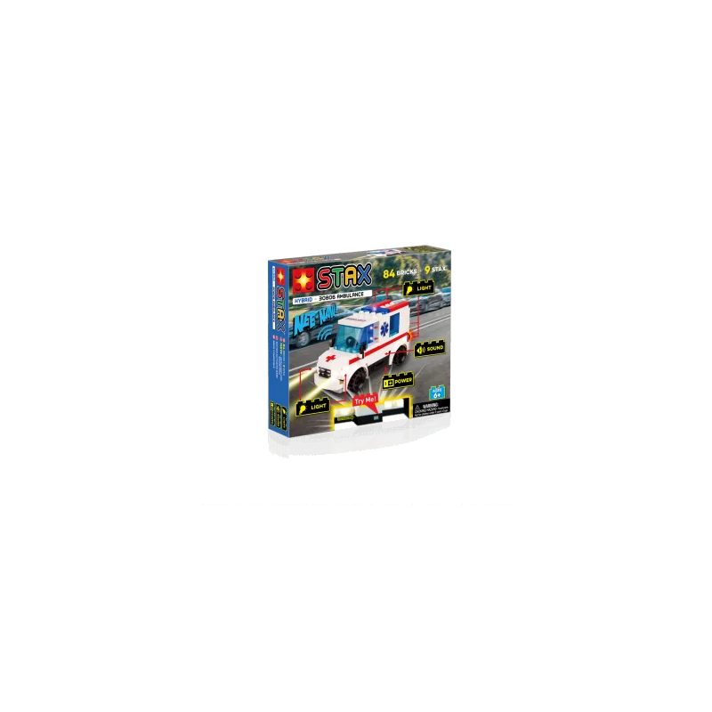 Izsauciet ārstu! Ar šo automašīnu jūs ātri nokļūsiet pie pacienta, kurš ļoti gaida palīdzību.Tiklīdz šī automašīna sāk kustēties, ieslēdzas sirēna, sāk mirgot bākugunis, priekšējie un aizmugurējie lukturi. Tas ilgs apmēram 5 sekundes.Detalizācijas var savienot ar Lego klucīšiem.STAX Hybrid ir skaņas un gaismas efekts. Aktivizējas uz 5 sekundēm katru reizi, kad konstruktors tās pakustina.