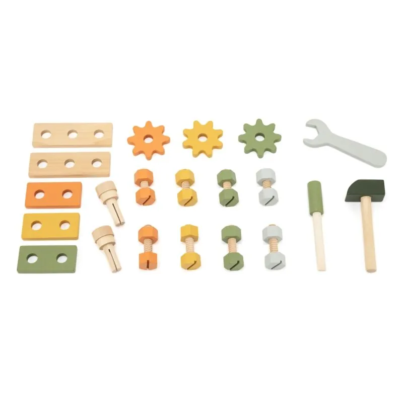 Skrūvgriezis, āmurs, uzgriežņu atslēga, skrūves, uzgriežņi, zobrati un konstrukcijas elementi, kas ļauj attīstīt radošas idejas. Bērni var veidot savas struktūras, veicinot savu iztēli un apgūstot problēmu risināšanu;