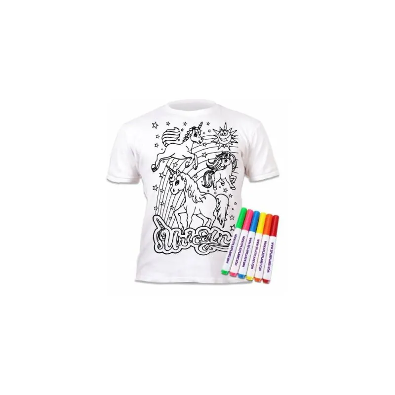 Viena T-krekls - bezgalība dažādu radījumu!Lietošana: krāsot T-kreklu ar komplektā esošajiem flomāsteriem, valkāt, mazgāt un atkal krāsot. Flomāsteri ir mazgājami, netoksiski. Zīmējot novietojiet zem attēla baltu lapu, ja vēlaties, lai krāsas nenokrāsotu aizmugurējo daļu.Mazgāt 40 ͦ temperatūrā. Var mazgāt kopā ar citiem baltiem audumiem, krāsas neatstāj pēdas.Flomāsteri var tikt izmantoti zīmēšanai uz citiem audumiem. Sastāvs 100% kokvilna.