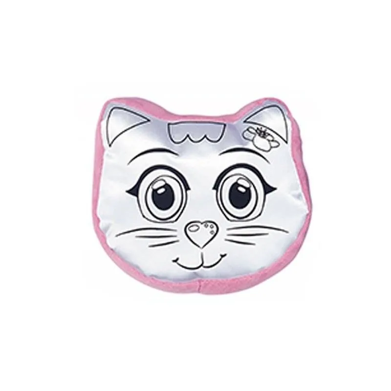 Kastītē ir dekoratīvs spilventiņš kaķīša formā un 4 krāsaini marķieri, ar kuriem varēs izkrāsot attēlu un tādējādi izrotāt spilvenu.
