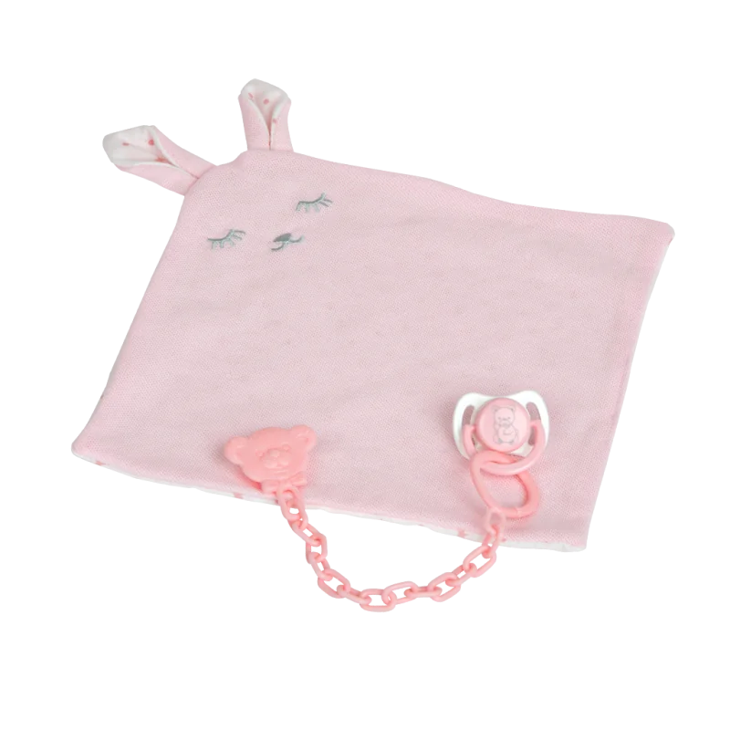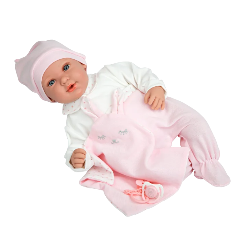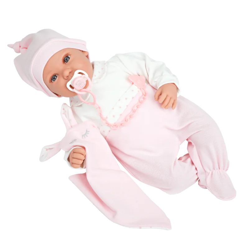 Lelles acis ir ļoti izteiksmīgas, rada reālistiska skatiena iespaidu.Ir skaņas efekts. Nospiežot vēderiņu, raud. Komplektā ietilpst baterijas.Lelles lūpas ir atvērtas, lai varētu ievietot knupīti.Vēderiņš ir auduma, jo ir ievietots mehānisms;Lelles izgatavotas no polivinila - ļoti maiga un mīksta materiāla.Lelli var likt jebkurā lelles ratiņos.Lelle ir ģērbta rozā un baltos apģērbos.Visi apģērbi ir roku darbs, pārdomāti līdz sīkākajai detaļai un izgatavoti ļoti rūpīgi.Lelles augstums: 45 cm.Iepakojums: plastmasas maisiņš.Droša un piemērota spēlēšanai bērniem no 2+ gadiem.Visas lelles ir sertificētas ar CE zīmi.Leļļu un to apģērbu izcelsmes valsts - Spānija.