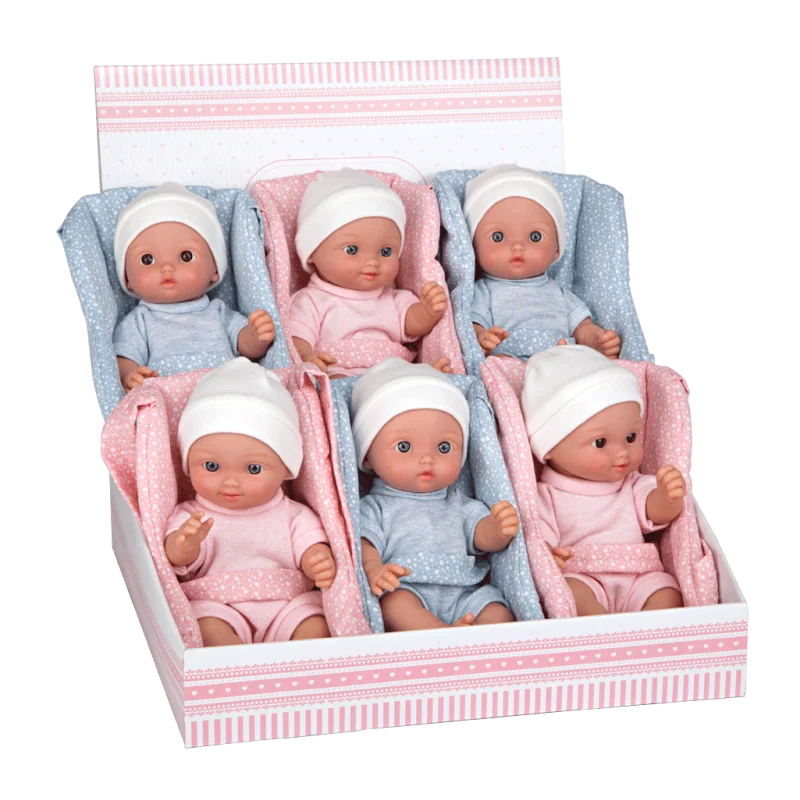 Šīs mīļās un burvīgās lellītes - mazuļi, noteikti patiks visiem leļļu mīļotājiem.Lellīšu acis ir ļoti izteiksmīgas, rada reālistiska skatiena iespaidu.Lellīšu kājas un rokas ir elastīgas, tās var sēdināt, stāvēt, mainīt pozas, ērti apģērbt.Lellītes izgatavotas no polivinila - ļoti maiga un mīksta materiāla.Lellītes apģērbtas dizaineru radītos apģērbos.Visi apģērbi ir roku darbs, pārdomāti līdz vissīkākajai detaļai un izgatavoti ļoti rūpīgi.Ir mīksta nesēja ar rokturiem;Lellītes smaržo pēc vaniļas.Var mazgāt.Lellītes augstums: 26 cm.Droša un piemērota spēlēšanai bērniem no 2+ gadiem.Visas lelles sertificētas ar CE zīmi.Lellīšu un to apģērbu izcelsmes valsts - Spānija.