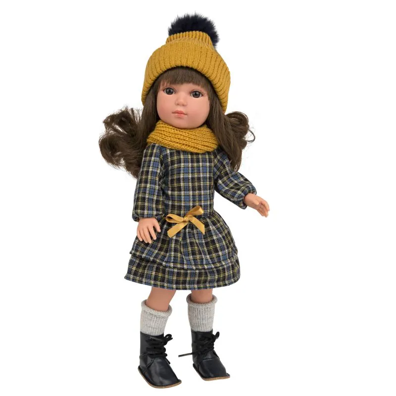 Lelles acis ir ļoti izteiksmīgas, rada reālistisku skatiena iespaidu.Stilīgi, gari, kupli mati, kurus var ķemmēt.Lelle ir ģērbta stilīgā, rūtainā kleitā un ar sasienamiem, melniem, ādas mokasīniem. Stilīga cepurīte un šallīte.Lelles drēbes ir roku darbs, pārdomātas līdz sīkākajām detaļām un izgatavotas ļoti rūpīgi.Lelles kājas un rokas ir elastīgas, to var sēdināt, stāvēt, mainīt pozas, ērti ģērbt.Iepakojums: liela, kartona kastīte ar caurspīdīgu logu. Tā ir patiešām lieliska dāvanas ideja.Lelle ir izgatavota no vinila - mīksta, maiga materiāla.Lelli var mazgāt.Piemērota vešanai bērnu leļļu ratiņos.Lelles augstums: 36 cm.Droša un piemērota spēlēšanai bērniem no 3 gadiem.Visas lelles ir sertificētas ar CE zīmi.Leļļu un to drēbju izcelsmes valsts - Spānija.