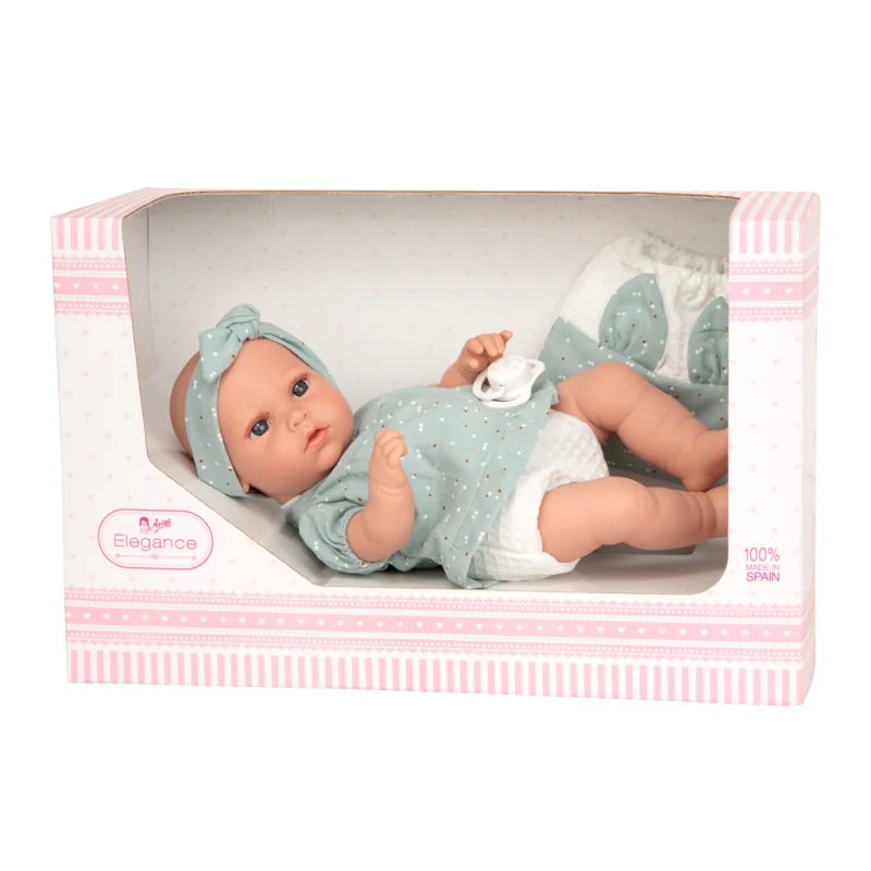 Lelles acis ir ļoti izteiksmīgas, rada reālistiska skatiena iespaidu.Ir skaņas efekts. Nospiežot vēderu, raud. Komplektā ietilpst baterijas.Lelles lūpas ir atvērtas, lai varētu ievietot knupīti.Vēders ir auduma, jo ir ievietots mehānisms;Lelles ir izgatavotas no polivinila - ļoti maiga un mīksta materiāla.Lelli var likt jebkurā leļļu ratiņos.Lelle ir ģērbta zaļos un baltos punktotos apģērbos.Visi apģērbi ir roku darbs, pārdomāti līdz sīkākajai detaļai un izgatavoti ļoti rūpīgi.Piemērota vešanai bērnu leļļu ratiņos.Komplektā ietilpst bērnu knupītis un maisiņš lelles aksesuāriem.Lelles augstums: 33 cm.Iepakojums: firmas, krāsaina kartona kaste;Kastes izmēri 37 x 17.50 x 23.50 cmDroša un piemērota spēlēšanai bērniem no 2+ gadiem.Visas lelles ir sertificētas ar CE zīmi.Leļļu un to apģērbu izcelsmes valsts - Spānija.