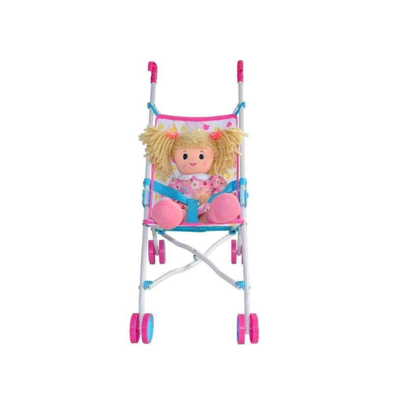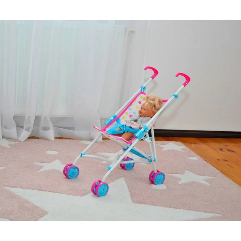 Metāla rāmis.Drošības jostas.Plastmasas riteņi.Aizsargājošs slēdzis pret automātisku salocīšanu.Salokāms mehānisms – lietussarga tips.Bērnu vecums 3+Ratiņi salokās plakani.Audums no poliestera - var mazgāt.