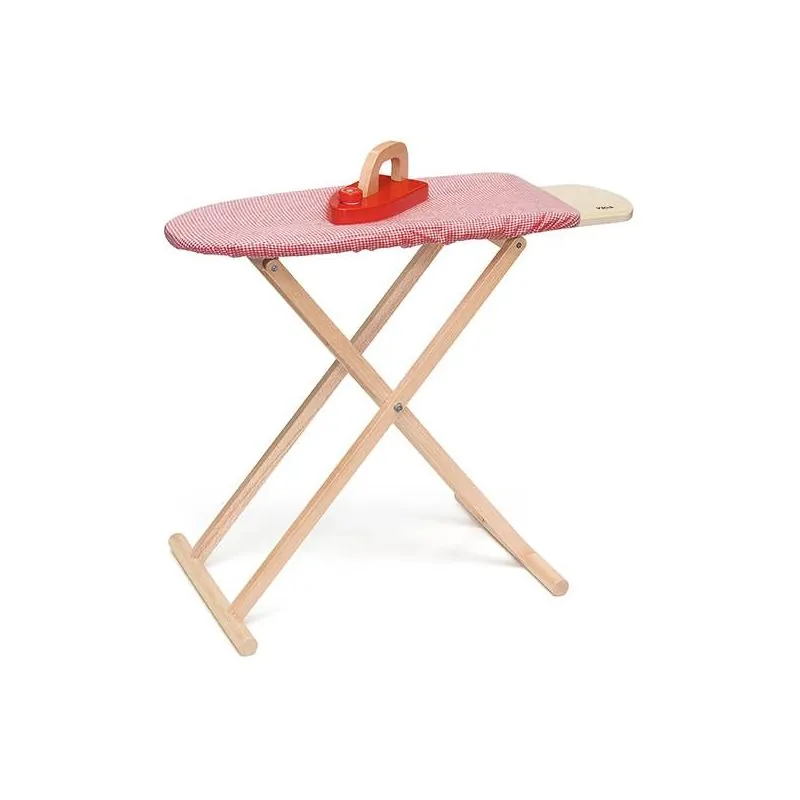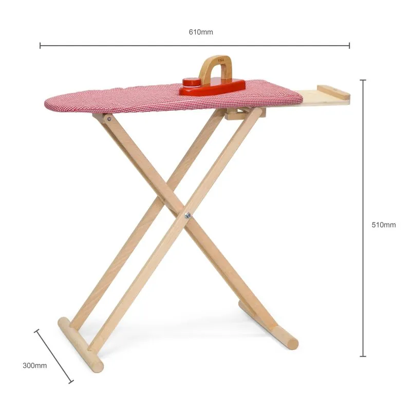 Koka gludināmais dēlis kopā ar gludekli.Šis komplekts palīdzēs vecākiem, spēles laikā, pieradināt bērnu rūpēties ne tikai par savām drēbēm, bet arī par lellēm un ģērbties kārtīgi.Koks ir lakots un krāsots ar bērniem drošiem līdzekļiem.Izmēri: 51 x 30 x 61 cm.