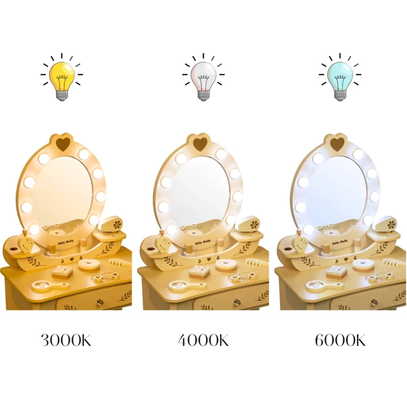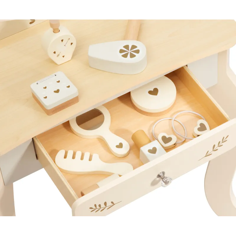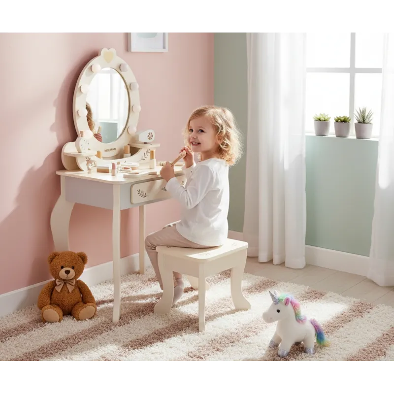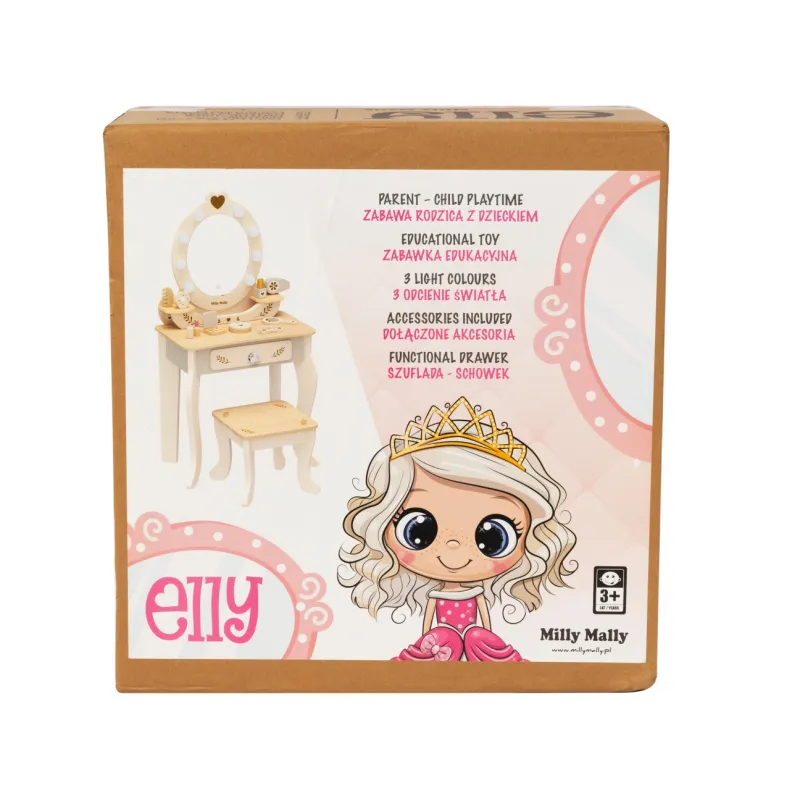 Elegantais „Elly“ kosmētikas galdiņš, kas izveidots, domājot par mazākajiem, ir lielisks veids, kā attīstīt iztēli, radošumu un rotaļīgi atdarināt pieaugušos. Paredzēts bērniem no 3 gadu vecuma.