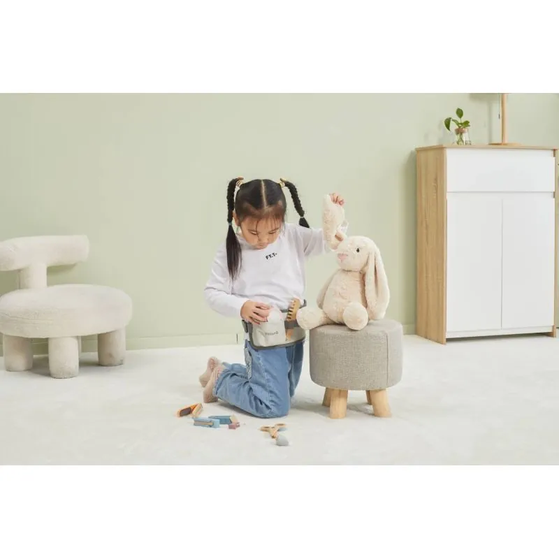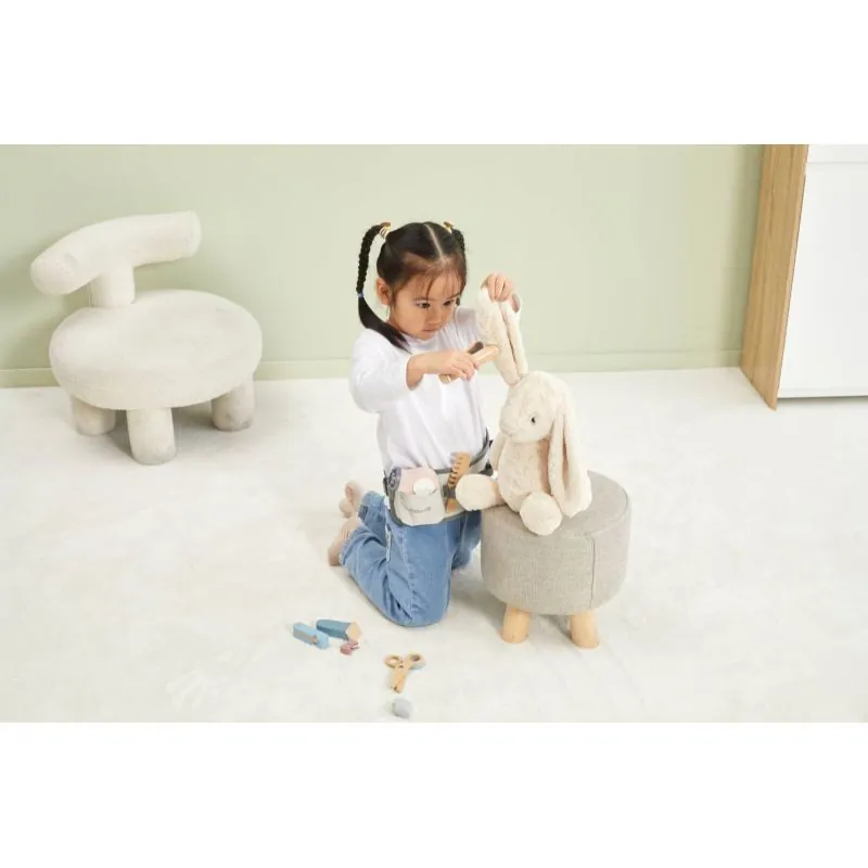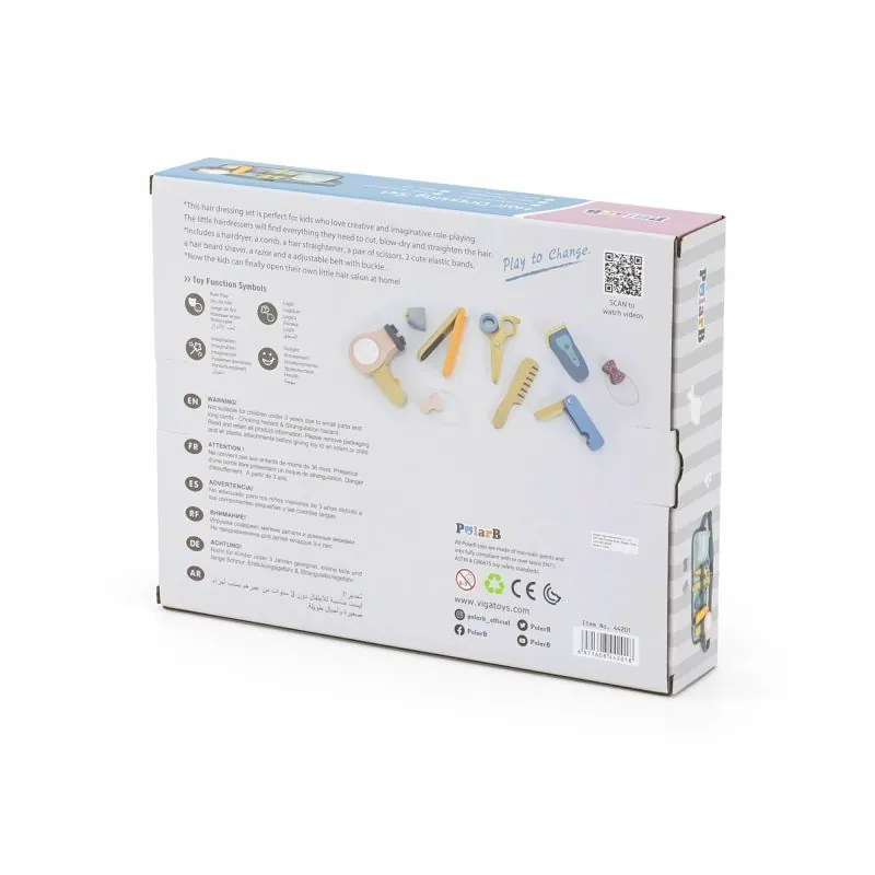 Spēle ļauj attīstīt iztēli un roku kā arī mākslinieciskās prasmes. Veicina bērnu komunikāciju un sadarbību. Mazie frizieri atradīs visu nepieciešamo matu griešanai, žāvēšanai vai taisnošanai.Komplektā ir matu fēns, ķemme, matu taisnotājs, šķēres, 2 jaukas gumijas, skuveklis, skusteklis un regulējama josta ar sprādzi.Tagad bērni beidzot var atvērt savu mazo frizētavu mājās!Visa lieta ir izgatavota no dižskābarža koka un krāsota ar netoksiskām maigām krāsām, kas piesaistīs uzmanību un veicinās kopīgu spēlēšanos, sniedzot daudz prieka. Krāsas ir 100% drošas, atbilst EN71 un ASTM drošības standartiem.Rotaļlieta ir iepakota krāsainā iepakojumā. Pateicoties estētiskajam iepakojumam, rotaļlieta ir lieliski piemērota dāvanai.Rotaļlieta paredzēta bērniem, kas vecāki par 36 mēnešiem.P: 320 mm x A: 30 mm x P: 115 mm