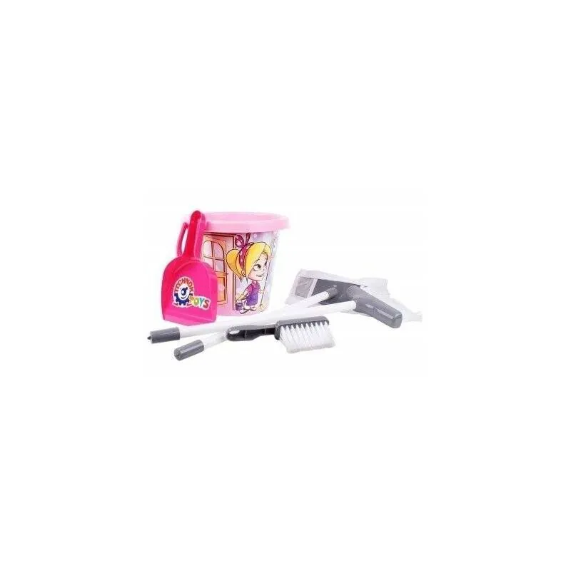 Komplektā ietilpst liels krāsains spainis, slotas un liekšķere.