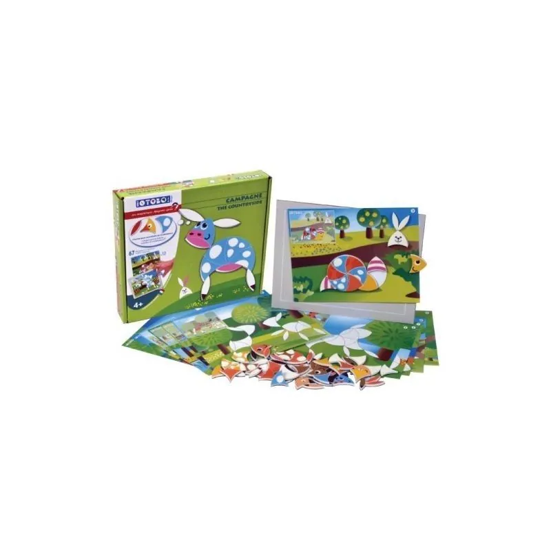 Puzle paredzēta bērniem no 4 gadu vecuma. Iesaistoša un radoša spēle. 3 dažādu formu detaļas, no kurām var izveidot dažādus attēlus: govs, ponijs, vista un citi lauku dzīvnieki. Dažādu rakstu un krāsu detaļas palīdzēs izveidot dažādus tēlus. Komplektā 12 dažādi attēli, uz kuriem tiek liktas detaļas un veidoti attēli.