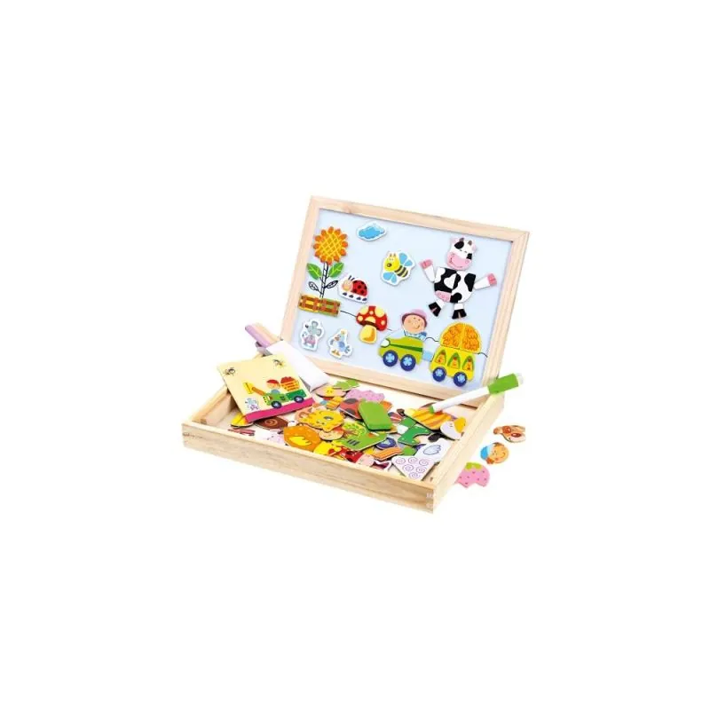 Interesanta un krāsaina magnētiskā puzle, lauksaimnieka fermas tēma. Ļaus bērnam no dažādām detaļām izveidot attēlus un apdarināt ar saviem zīmējumiem.