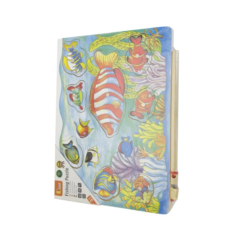 Komplektā ir koka dēlis ar krāsainu zemūdens pasaules attēlu un koka nūja ar magnētisku galu. Viss ir izgatavots no lakota koka, krāsots ar spilgtām, bērniem drošām krāsām.Spēlējiet ar "Viga" rotaļlietām, kas palīdz jūsu bērnam attīstīt loģisko domāšanu un motoriskās prasmes.Krāsas un tintes uz "Viga" rotaļlietām ir netoksiskas, bērnam drošas.Visas rotaļlietas atbilst Eiropas rotaļlietu drošības EN71 un ASTM standartiem.