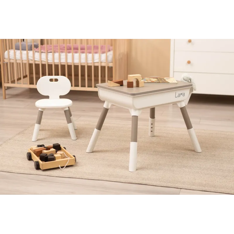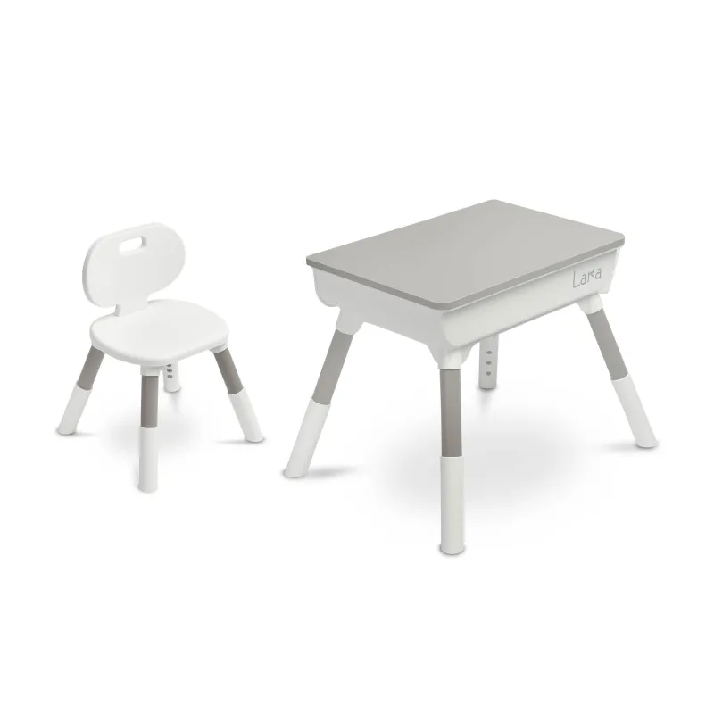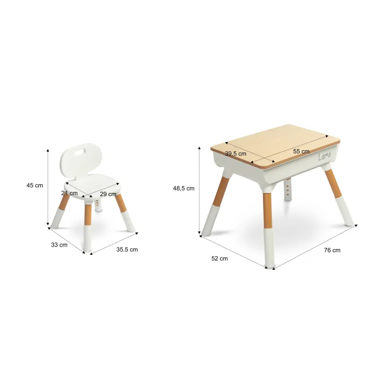 Lara ir daudzfunkcionāls galds, ideāli piemērots spēlēm, mācībām vai ēšanai. Pārdomātie izmēri nodrošina jūsu bērnam pietiekami daudz vietas zīmēšanai, kluču celtniecībai vai izglītojošo grāmatu lietošanai. Pateicoties funkcionālajam augstuma regulējumam, gan "Lara" galdu, gan krēslu var viegli pielāgot bērna augumam.