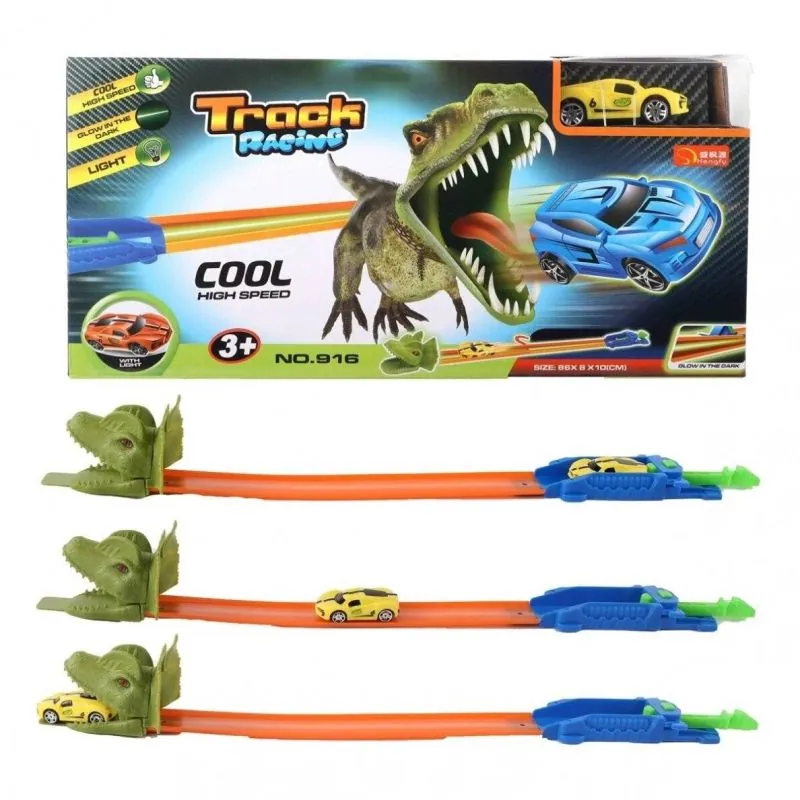 Dinozauru trase. Komplektā ietilpst mašīnīte. Ar gaismām. Spīd tumsā.