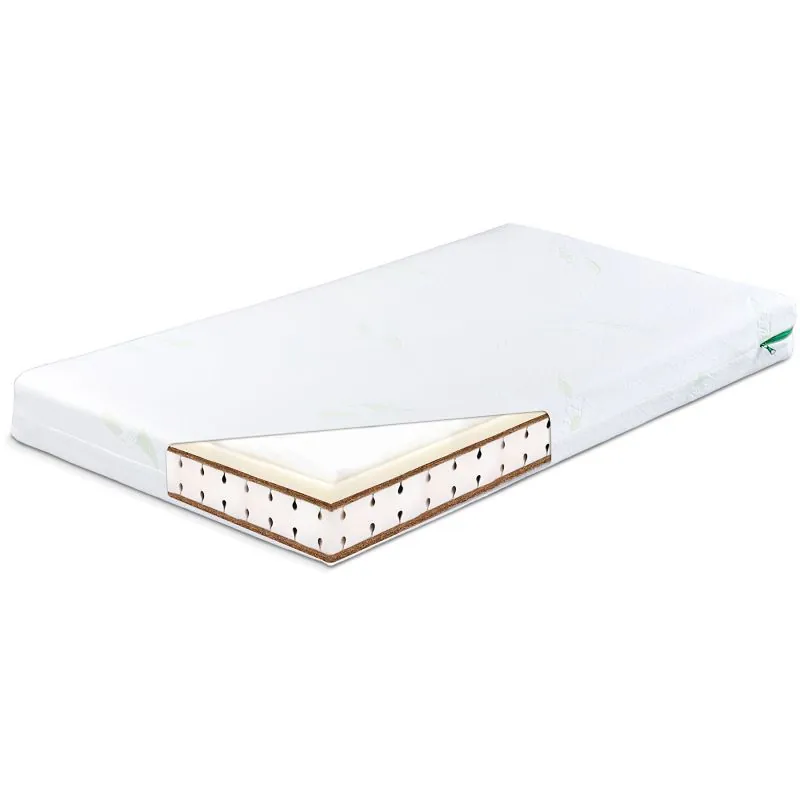 Četru slāņu (termoplastiskais/memory putas-kokoss-poliuretāna putas-kokoss) matracis nodrošina komfortablu bērna miegu;