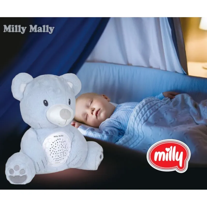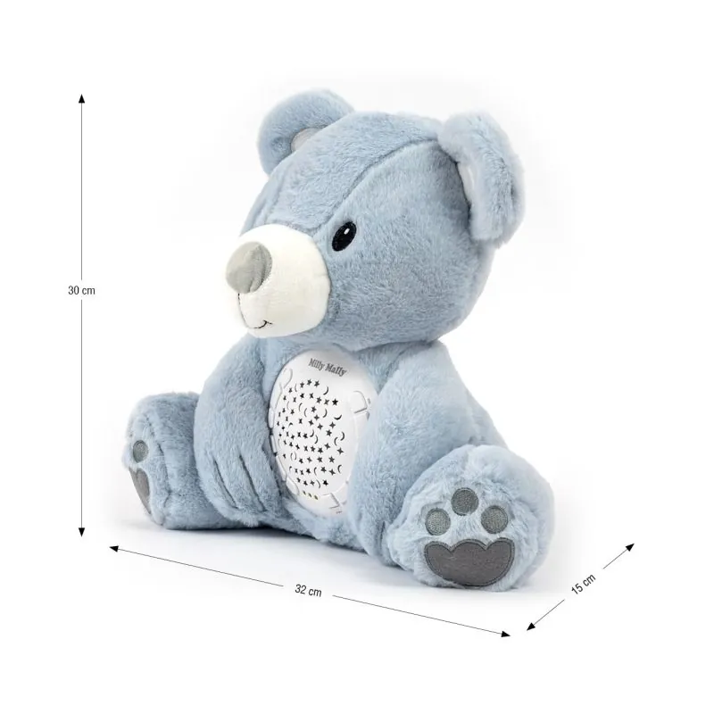 Milly Mally plīša lācis - projektors pārvērtīs jūsu bērna istabu par zvaigžņotām debesīm ar nomierinošām melodijām.