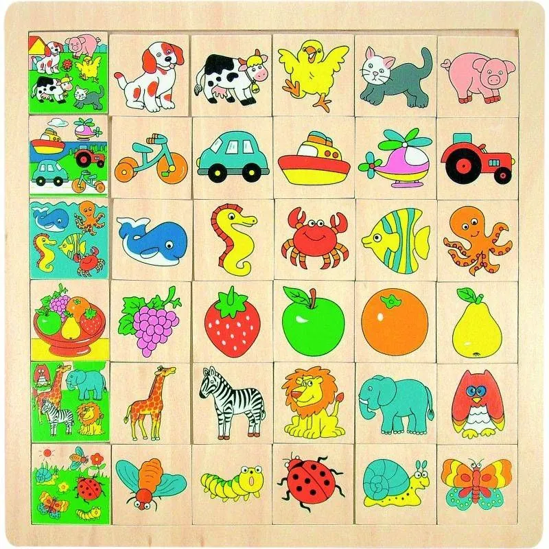 Visas kartītes sakraujas koka rāmī. Kreisajā pusē redzam 6 formas pēc tematikas, jūsu bērnam tikai atliek sakārtot formas pēc tematikas.Šāda veida uzmanības spēle attīsta loģisko domāšanu, smalko motoriku, palīdz iepazīties ar dažādām dzīves tēmām.Izmērs: 30,5 x 1 x 30,5 cm.Šī mācību rotaļlieta ieteicama bērniem no 3 gadiem.