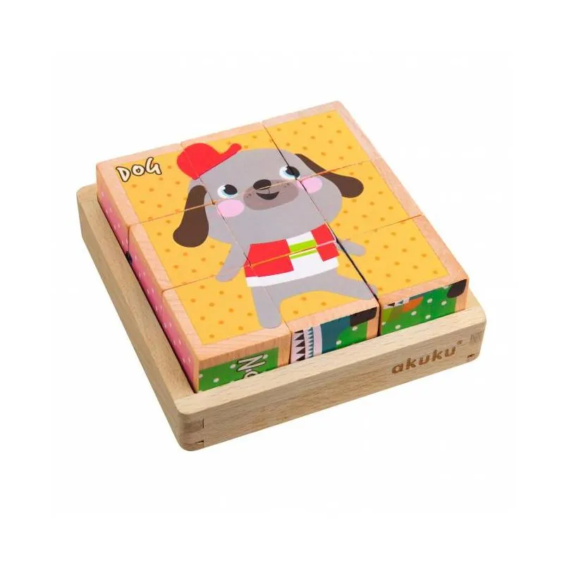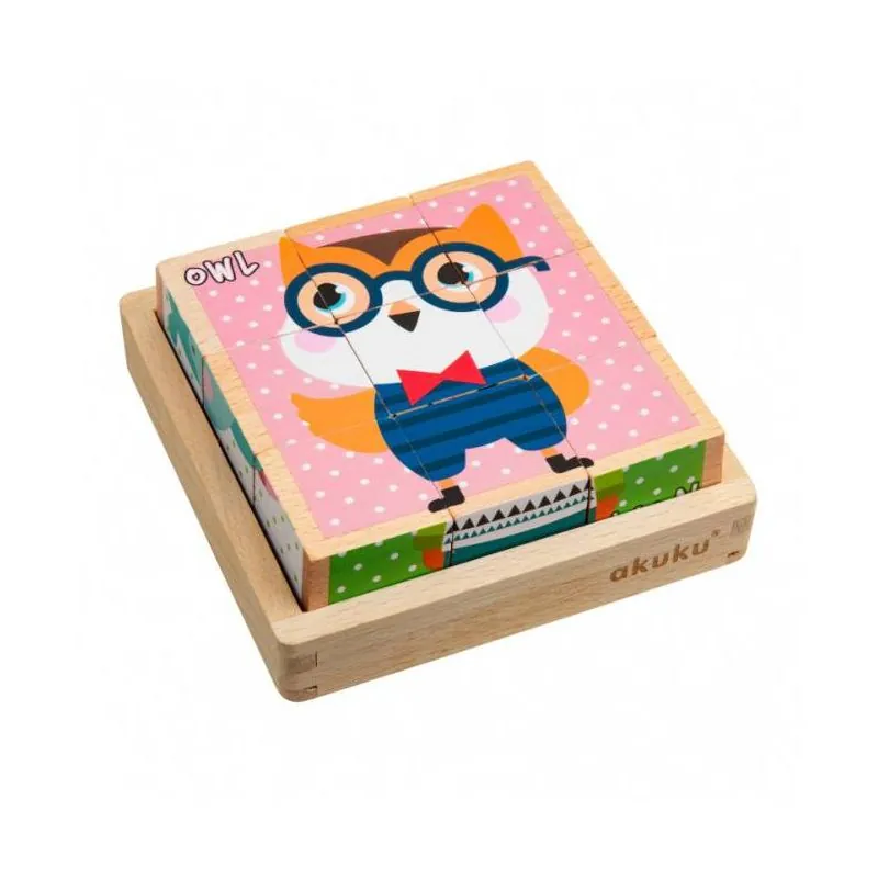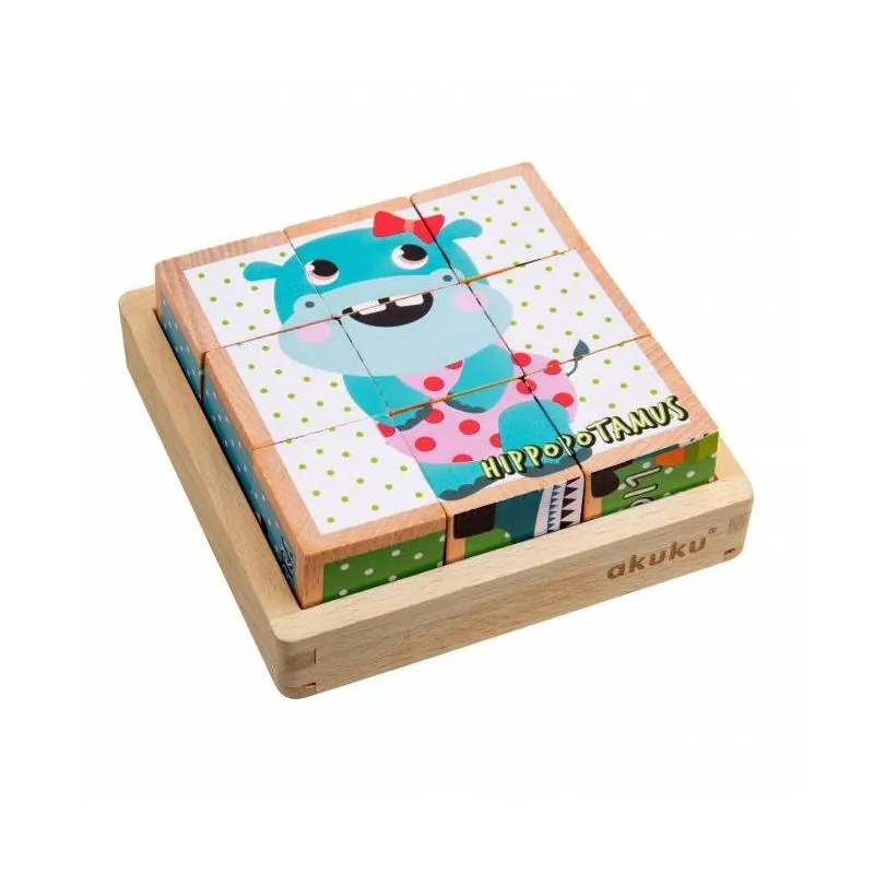 Tie veicina radošumu, dod iespēju veidot dažādas struktūras.Koka klucīši lieliski piemēroti arī pašiem mazākajiem bērniem.Spēlējoties jūs mācāt savu mazuli par apkārtējo pasauli.Bērns mācās formas, krāsas un dažādus dzīvniekus.Koka paliktnis ļauj viegli sakraut klucīšus, nest un uzglabāt.Katram klucītim ir 6 puses, un tā var izveidot 6 dažādus attēlus.Tie ir izgatavoti no droša un ekoloģiska koka.Drukāšanā izmantotās krāsas atbilst standartiem un ir pilnīgi drošas pašiem mazākajiem.Komplektā ietilpst 9 klucīši + paliktnis.