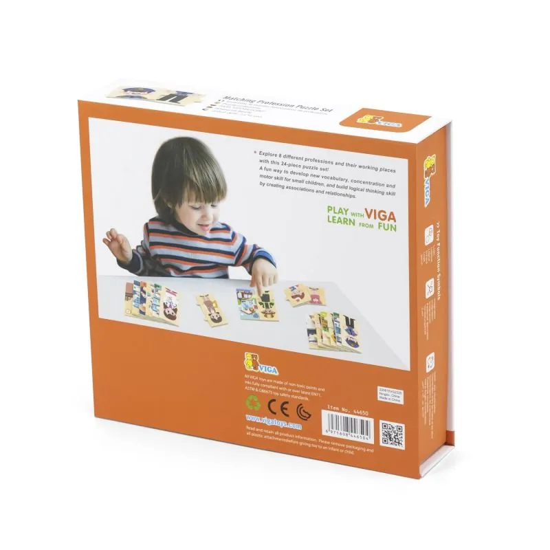8 koka puzles detaļas, katra sastāv no 3 mīklām.Attēlu motīvi – populāras profesijas, piemēram, ārsts, policists, ugunsdzēsējs un citi.Bērniem būs iespēja paplašināt dažādu profesiju zināšanas, iegūt spēju atpazīt un saskaņot elementus. Šī rotaļlieta arī palīdz attīstīt koncentrēšanās spējas, analītiskās prasmes un radošumu. Viss ir izgatavots no dižskābarža koka un krāsots ar netoksiskām krāsām, kas piesaistīs uzmanību un veicinās jautrību, vienlaikus sniedzot daudz prieka. Krāsas ir 100% drošas, atbilst EN71 un ASTM drošības standartiem.Puzles ir iepakotas krāsainā kartona kastē, lieliski piemērotas dāvanai.Rotaļlieta paredzēta bērniem no 18 mēnešu vecuma.Iepakojuma izmērs:Garums: 206 mm x A: 46 mm x P: 194 mm