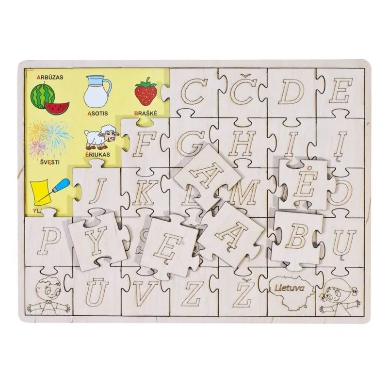 Koka puzle ne tikai ļaus ātri un jautri apgūt visu lietuviešu alfabētu, bet arī attīstīs smalko motoriku un atmiņu.