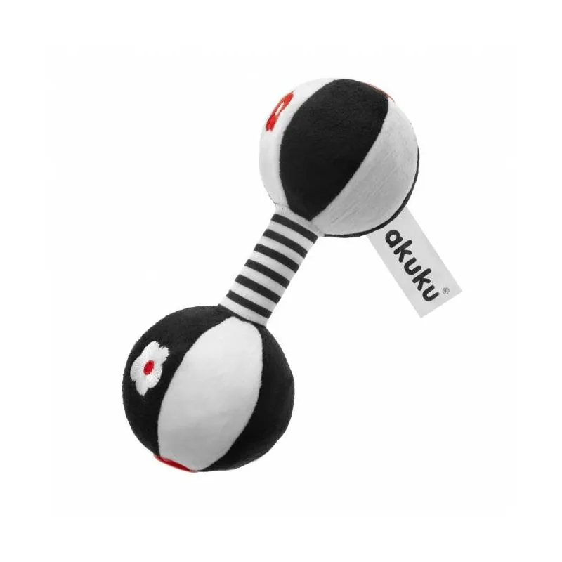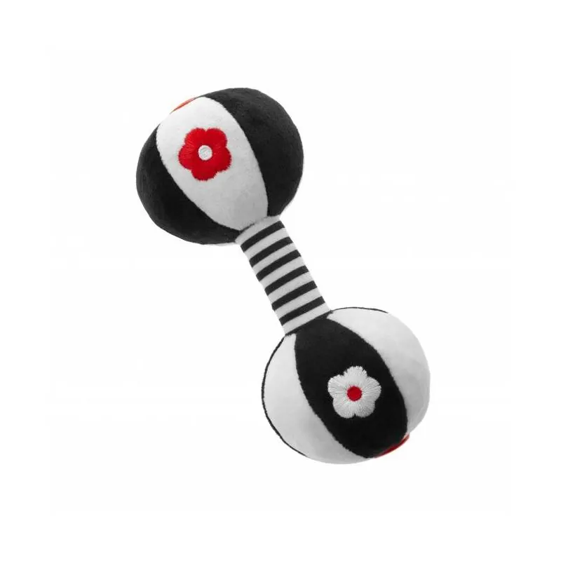 Mīksts grabulis izgatavots no patīkami taustāma plīša auduma, kas nekairina mazuļa maigo ādu.Tas atbalsta attīstību no pirmajām dienām.Attīsta motorikas un roku prasmes.Rotaļlieta stimulē redzi, pateicoties īpaši izmantotajām krāsām, kuras mazulis redz pirmās.Iekšpusē iebūvētie zvaniņi ļauj mazulim apgūt pirmās skaņas, attīsta viņa dzirdes sajūtu.Rotaļlietas izmērs 17x7 cm