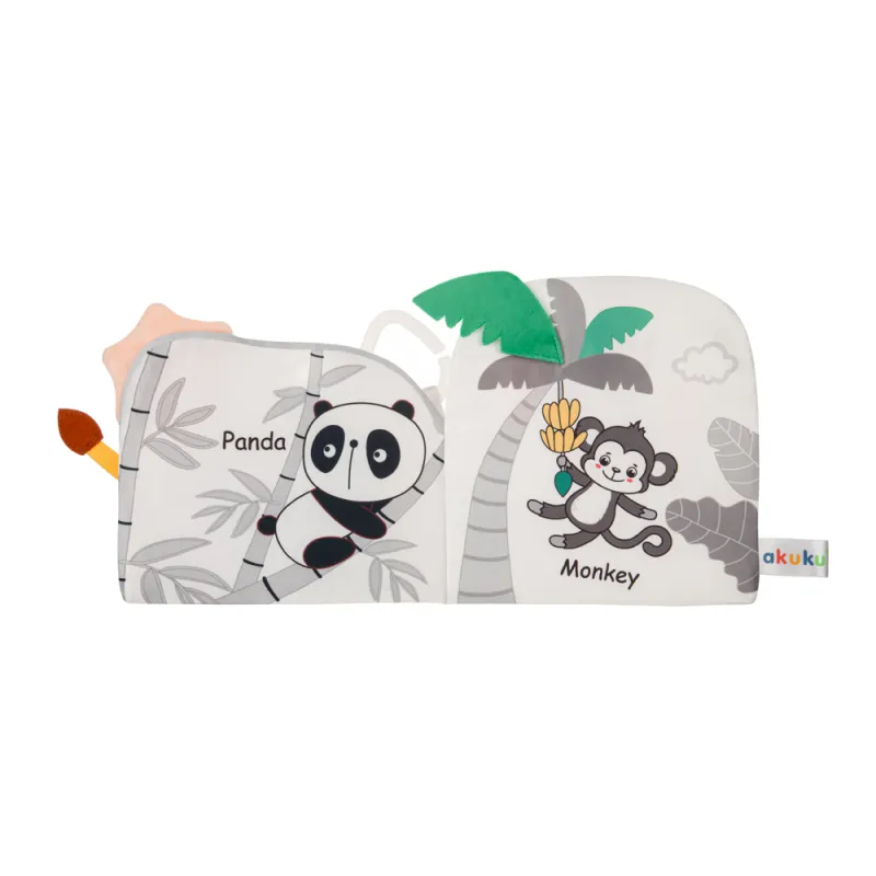 Sensorie elementi – Katrā lapā ir dažādas faktūras (piemēram, mīkstas lapas, plīša elementi, čaukstoņa) un taustes akcenti, kas iepriecinās jūsu zīdaini un veicinās saziņu;