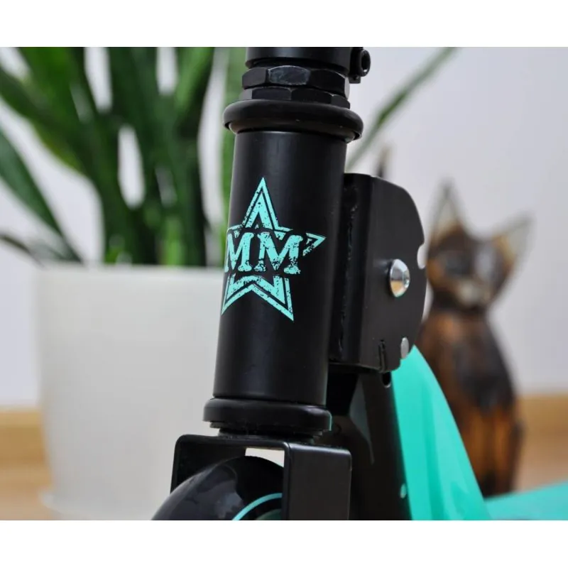 Vieglā un izturīgā plastmasas platforma - ar neslīdošu virsmu, balstīta uz metāla rāmja. Alumīnija stūre. Inovatīva salokāma sistēma.Gumijas neslīdoši stūres rokturi. Regulējams stūres augstums 3 līmeņos: 63,5 cm x 72,5 cm x 82,5 cm. Gumijas riteņi izgatavoti no augstākās kvalitātes PU materiāla, neslīd un nodrošina atbilstošu saķeri. ABEC-5 gultņi. Aizmugurējā riteņa bremze. Maksimālais svars līdz 50 kg.