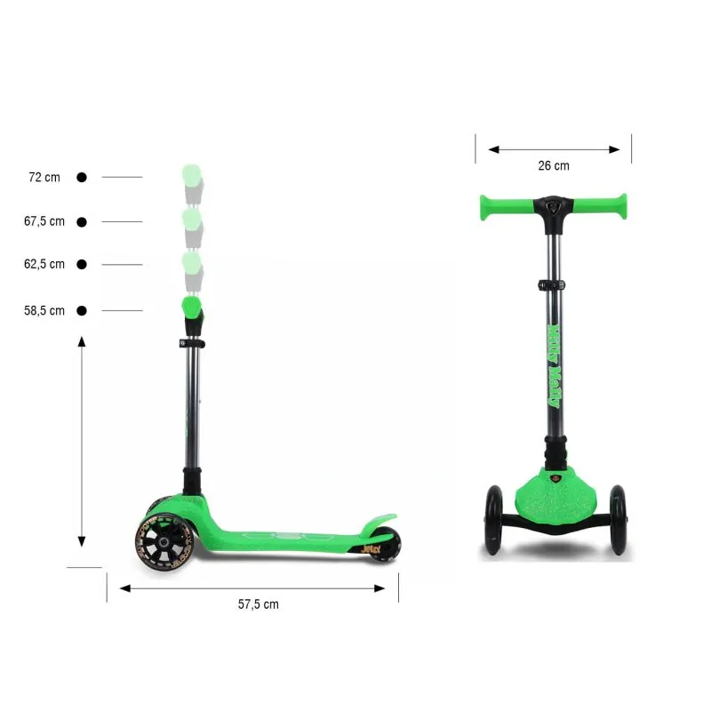 Pateicoties 4 līmeņu roktura regulēšanai (no 57 līdz 72 cm), JELLY aug kopā ar jūsu bērnu, pielāgojoties viņa augumam un vajadzībām. Vienkāršā saliekamā sistēma ļauj ātri salocīt skrejriteni un paņemt to līdzi jebkurā vietā – bez nekādas piepūles.