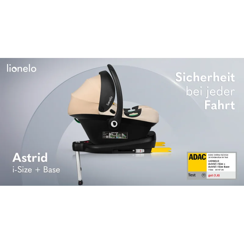 Astrid i-Size paredzēts montāžai uz aizmuguri un tam ir 3 punktu drošības jostas un regulējams galvas balsts, lai nodrošinātu lielāku aizsardzību un ērtību.