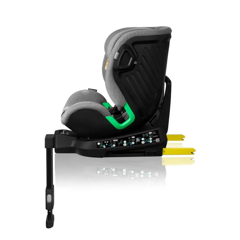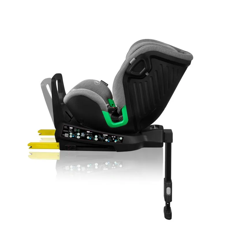Izturīga un ātra autokrēsliņa uzstādīšana automobilī ar ISOFIX sistēmu un stabilizējošu kāju, kas vienmērīgi sadala svaru pēkšņas bremzēšanas laikā. Pateicoties kājai, sēdeklis viegli griežas dažādās pusēs.