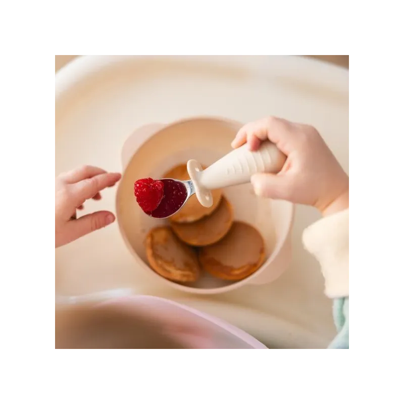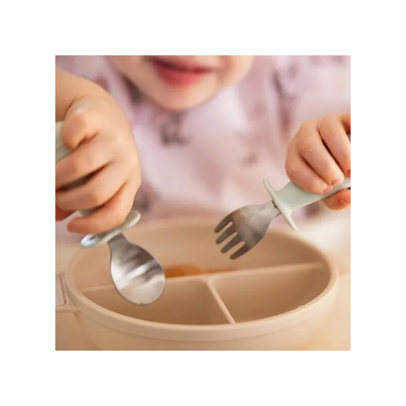 Plašas, apaļas rokturi ar izvirzījumu ideāli piemērotas mazām rociņām. Viegls dizains nodrošina ērtu turēšanu. Tas ir lielisks komplekts patstāvīgai ēšanas sākšanai un satveršanas prasmju attīstīšanai;