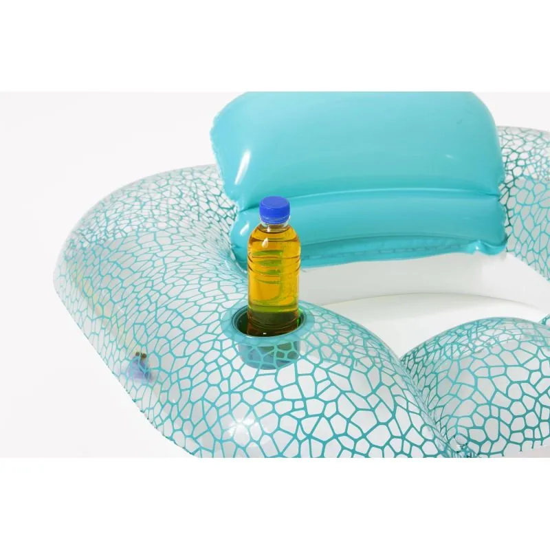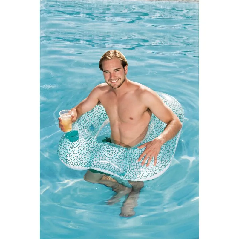 Šis piepūšamais peldēšanas kvadrāts ar spilvenu ir ar regulējamu atzveltni un krūzīšu turētāju.
