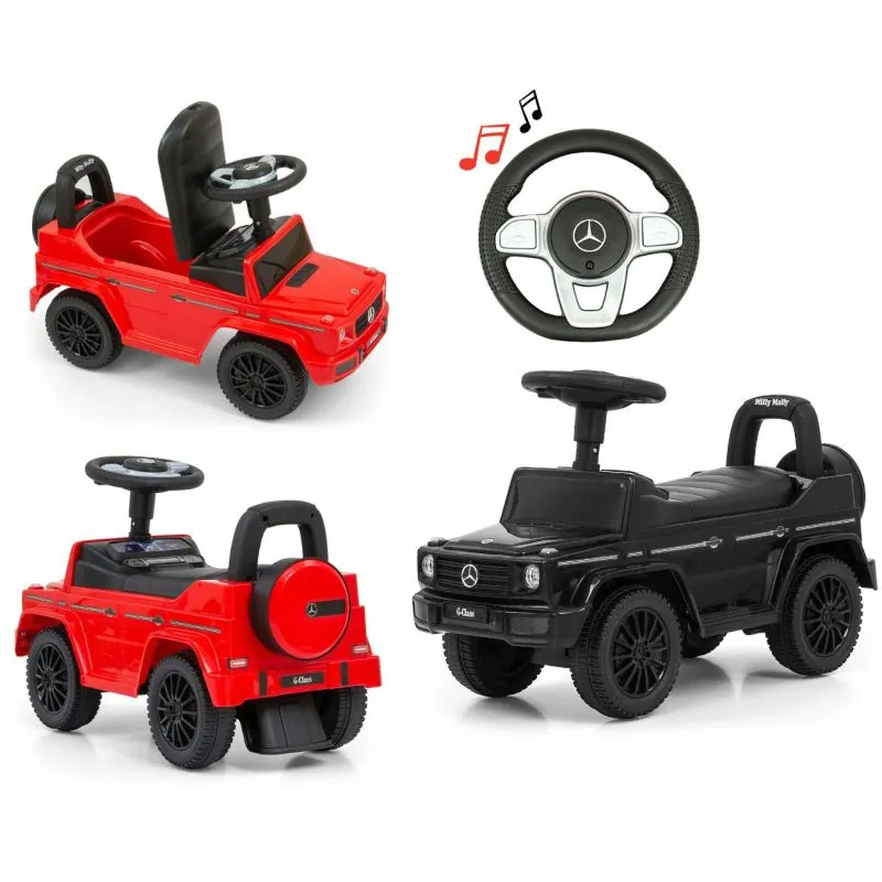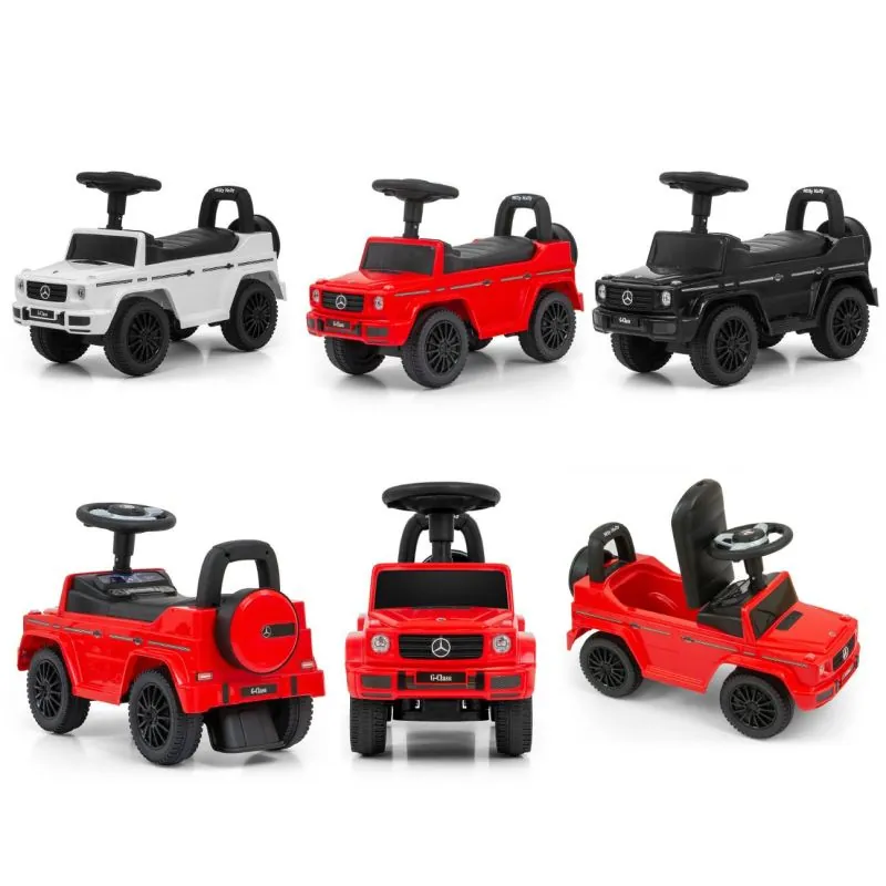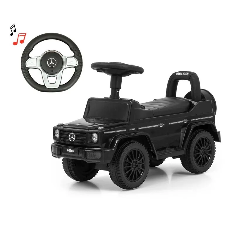 Torsionālie priekšējie riteņi, vadāmi ar rokturi.Trīs spieķu stūre ar Mercedes logotipu, ar skaņas signālu un motora skaņu.Aizsardzība pret transportlīdzekļa apgāšanos.Kaste zem sēdekļa.Ērts un elegants sēdeklis.Metāla riteņu asis.Vecums 12-36 mēneši.Maksimālais svars 25 kg.CE drošības sertifikāts.Barošana: 2 AA baterijas (nav iekļautas komplektā).