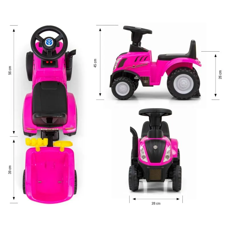 Stūre ar New Holland logotipu.Divas pogas ar skaņas signālu un dzinēja iedarbināšanas skaņām, kā arī iespēja ieslēgt/izslēgt gaismas.Piekabe ar grābekli un lāpstu.Ērts sēdeklis ar atzveltni.Metāla riteņu asis.Aizsardzība pret transportlīdzekļa apgāšanos atpakaļ.Vecums 12-36 mēneši.Riteņa diametrs: priekšējais - 14 cm, aizmugurējais - 20 cm.CE drošības sertifikāts.Barošana: 2 AA baterijas (nav iekļautas komplektā).