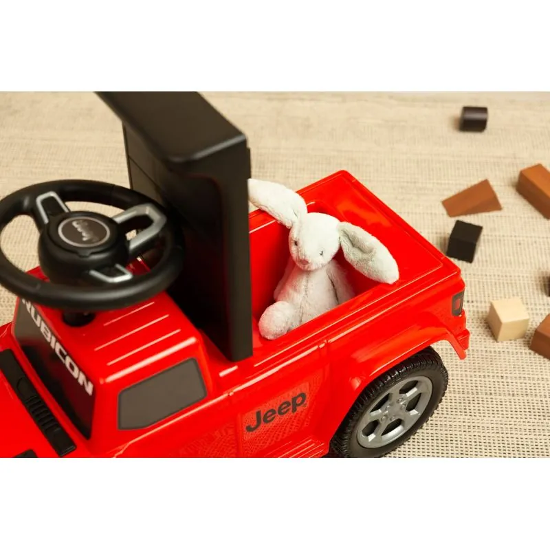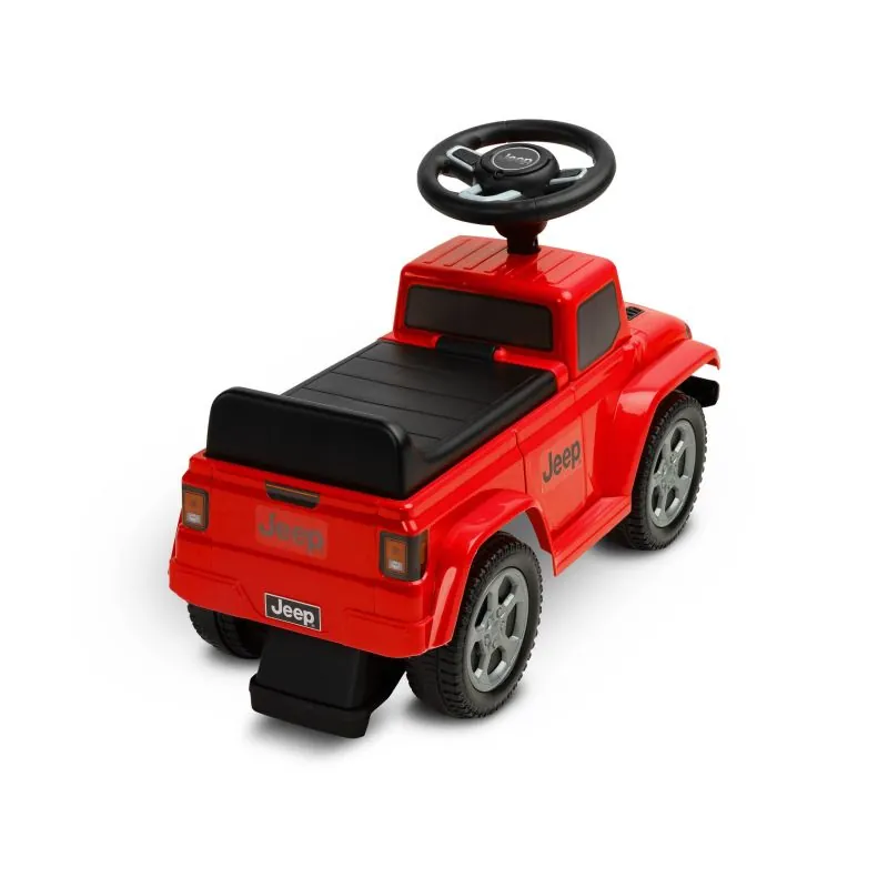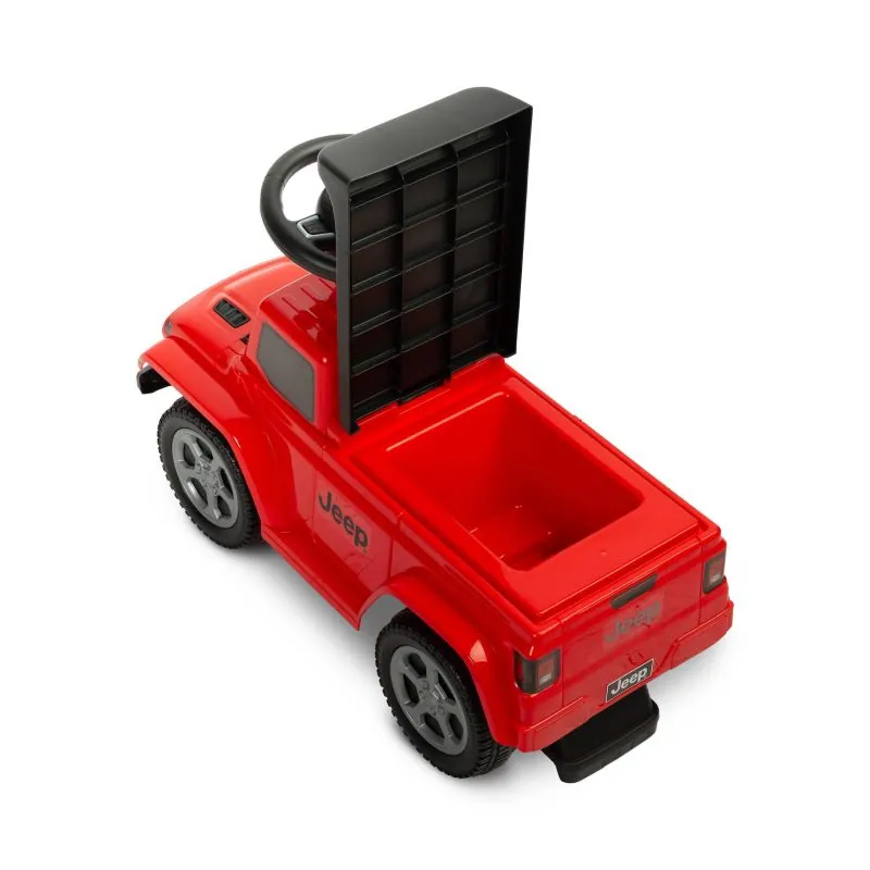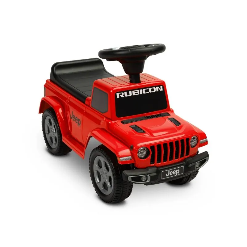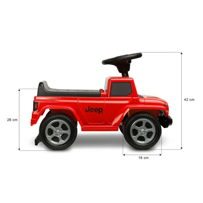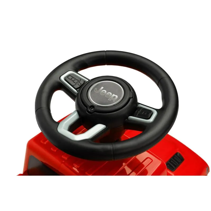 Jeep zīmola licenceGriežami priekšējie riteņiStūre ar pogām, darbināma ar 2 AA baterijāmPlašs sēdeklisPlaša rotaļlietu glabātuveAizsardzība pret apgāšanos