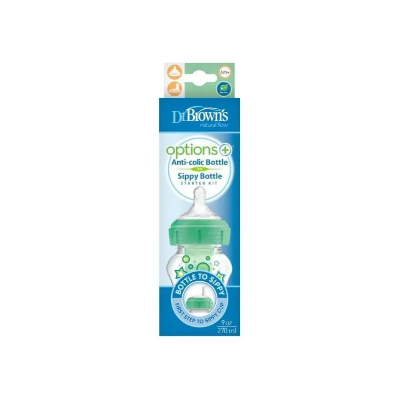 DR.BROWN'S pudelīte pārejas OPTIONS+ ar platu kaklu, zaļa 270ml + silikona uzgalis
