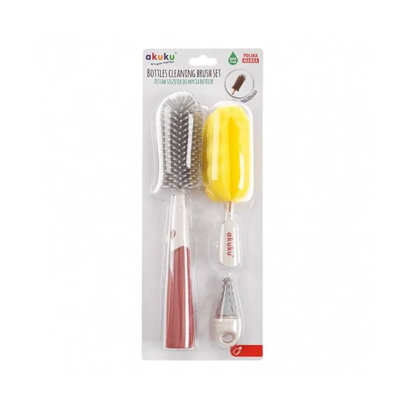 Komplektu veido suka ar mīkstiem silikona sariem, kas nodrošina pudeļu un ūdens pudeļu mazgāšanu bez skrāpējumiem, kā arī maināmu sūkļa uzgali, kas ir profilēts, lai pudelīti iztīrītu vēl rūpīgāk. Pareizi profilēts uzgalis sasniedz grūti pieejamas vietas, un ērts neslīdošs rokturis nodrošina stabilu saķeri.