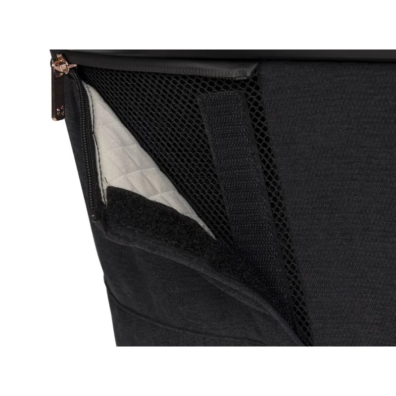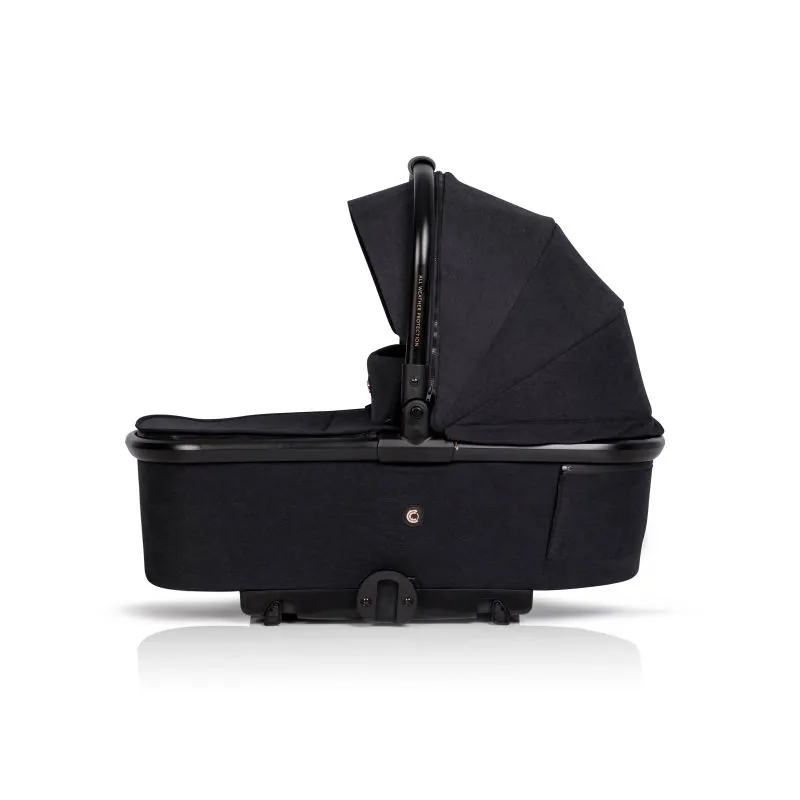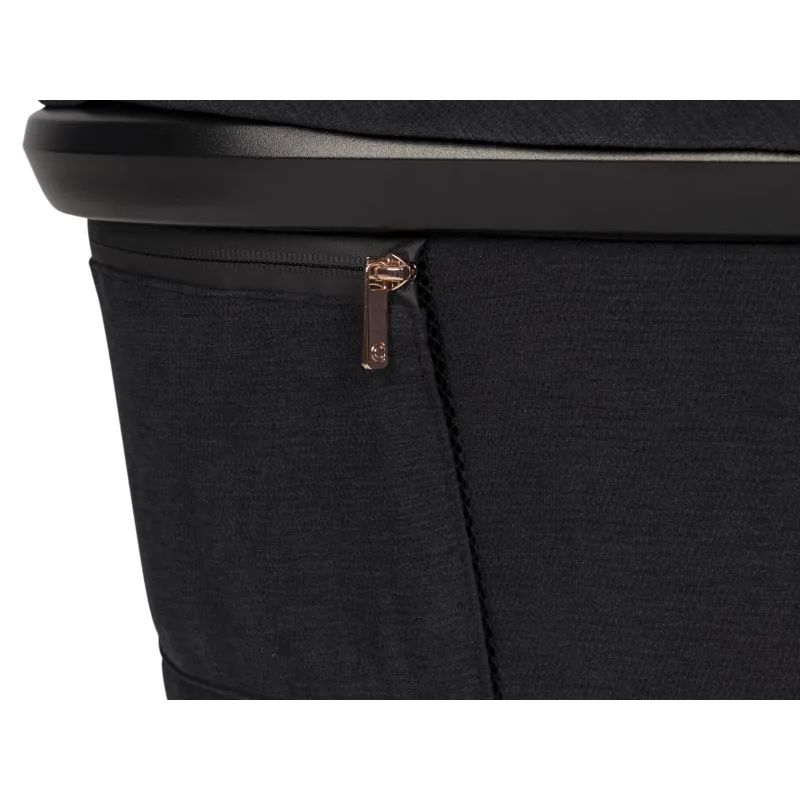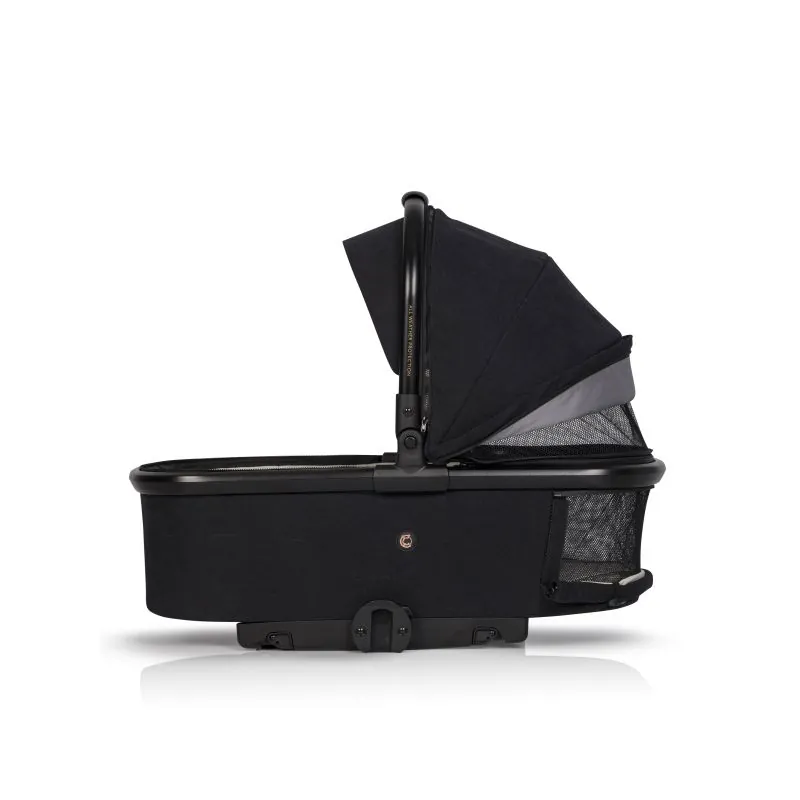Liels šūpulis (iekšējais garums 77 cm)Šūpulis ar atsevišķu lietus aizsargu,Ekoloģiskās ādas pārklāta nesšanas rokturis,Saules jumtiņš ar papildu noņemamu daļu,Apakšā plastmasas kājiņas un ventilācijas panelis.Plastmasas kājiņas salokās un iespējama šūpuļa šūpošanas funkcija.