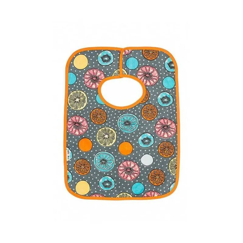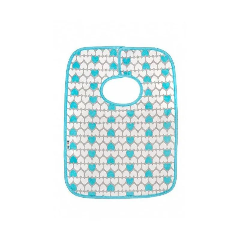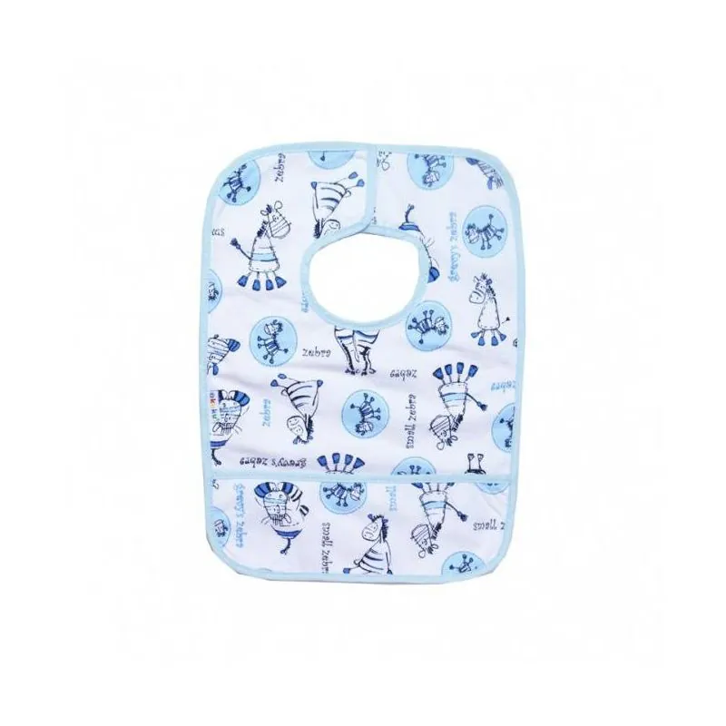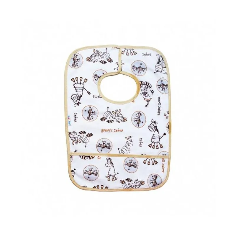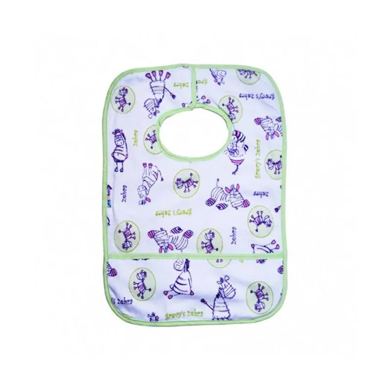 Izgatavots no augstas kvalitātes kokvilnas, nekairina mazuļa maigo ādu.Iekšējā daļa ir izklāta ar ūdensnecaurlaidīgu mīksta eļļaina auduma slāni, kas papildus aizsargā apģērbu no netīrumiem un padara priekšautiņu ūdensnecaurlaidīgu.Ērts un praktisks Velcro aizdare palielina priekšautiņa valkāšanas ērtumu..Sastāvs: 100% kokvilna, mīksts PVC audums.Izmērs: 28 cm (platums) x 23 cm (garums no kakla).