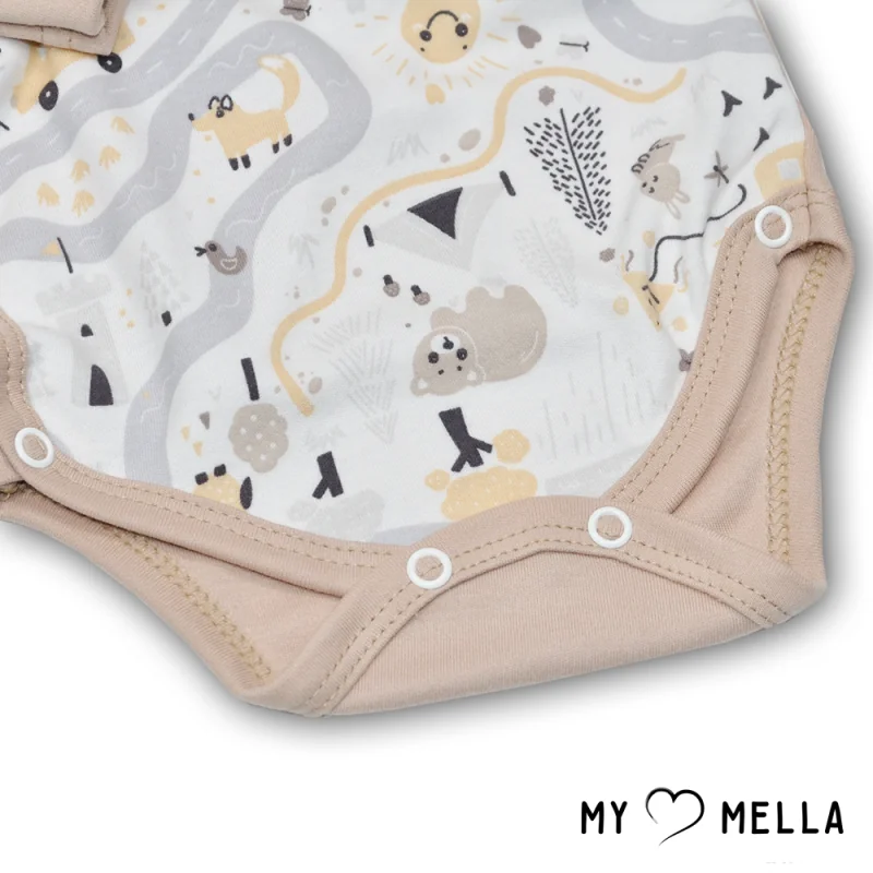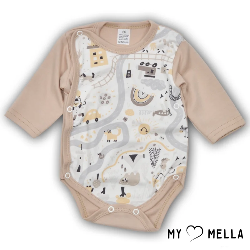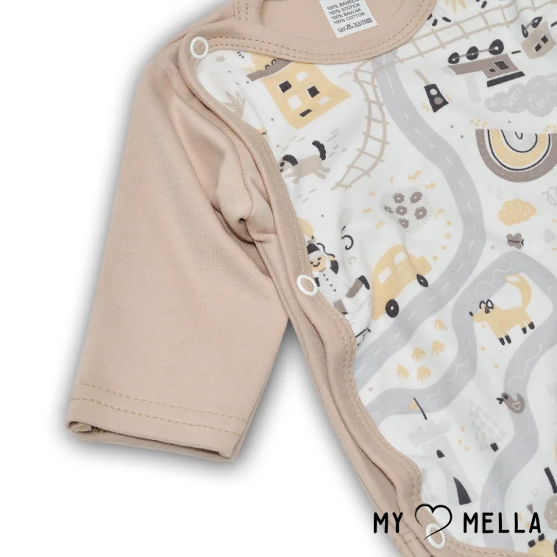 Spēlīga Pilsēta kolekcijas bodijs aizverams sānos un aizpogājams ar pogām.