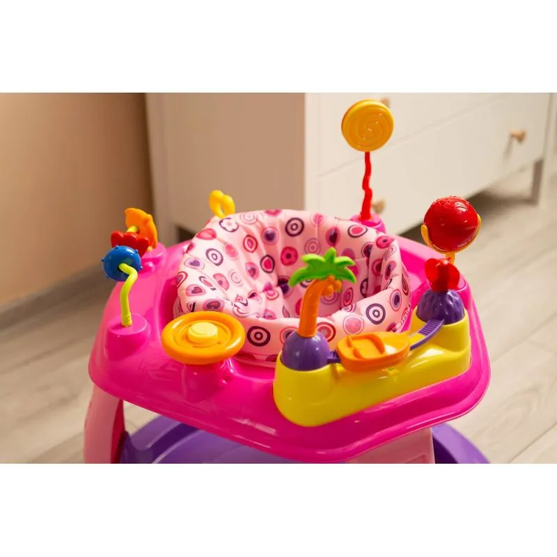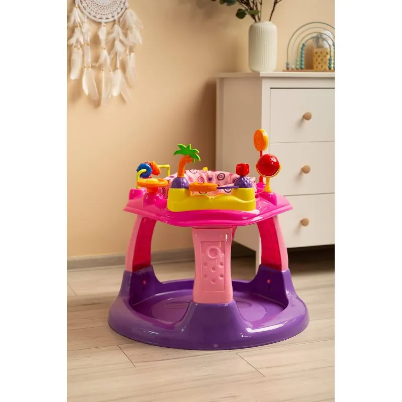 Ar krāsām piesātinātas rotaļlietas veicina taustes un redzes sajūtu, un, pateicoties kustīgajiem elementiem, uzlabo bērna motoriku. Sēdeklis griežas par 360°, tāpēc visi rotaļlietas ir viegli sasniedzamas. Interaktīvais panelis ar kuģi, kurā ir divas spīdošas pogas ar melodijām un izslēgšanas funkciju. Rotaļlietai ir 3 pakāpju sēdekļa augstuma regulēšana.Piemērots bērniem no 6 mēnešu vecuma - 12 kg.