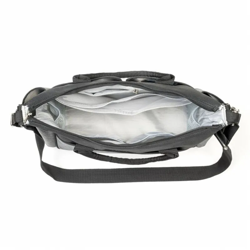 Soma ir 11 kabatas, tostarp paredzētas pudelēm, autiņbiksītēm, telefonam un dokumentiem, galvenā somas nodalījuma aizdare ir ar rāvējslēdzēju.